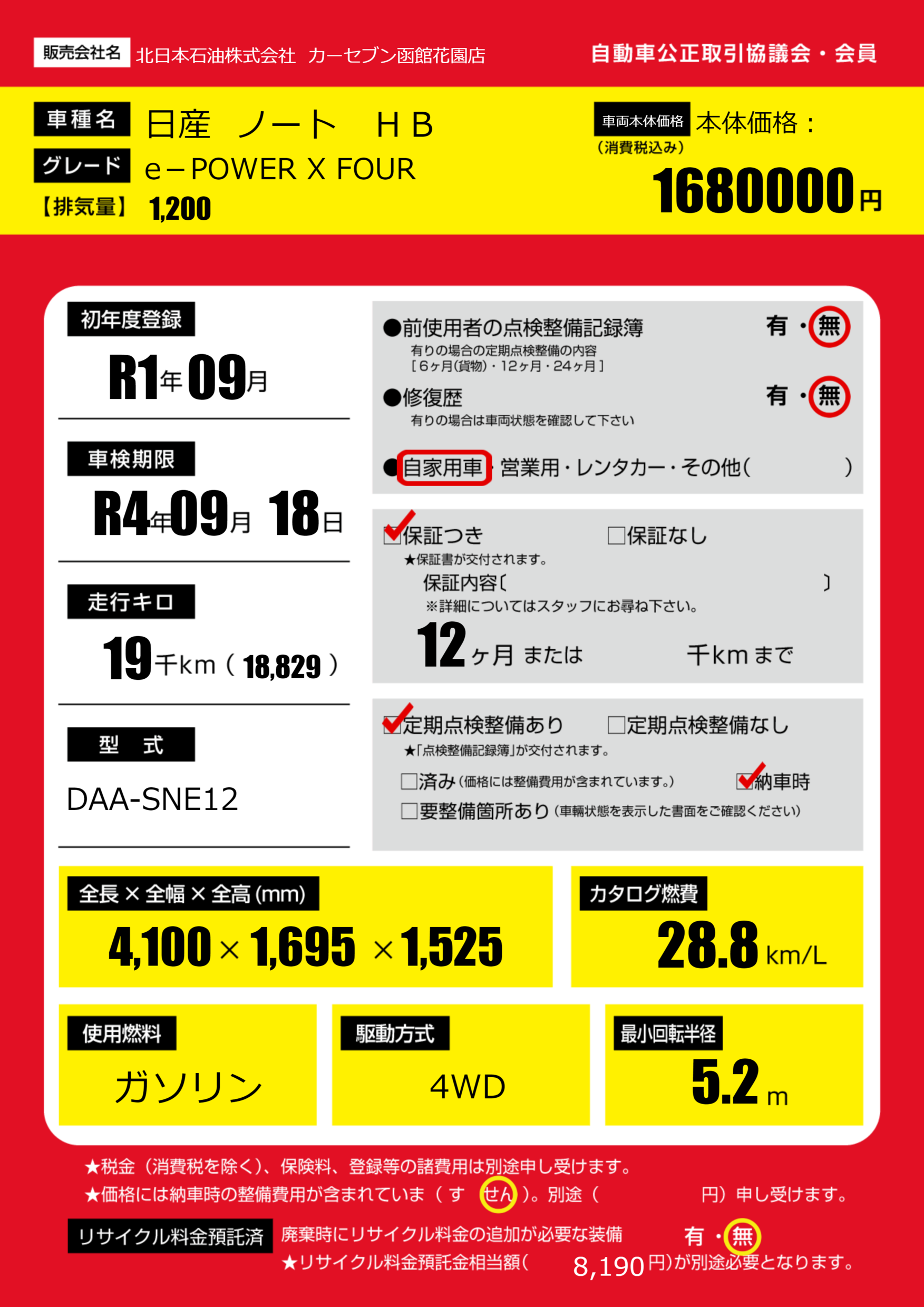 | 車名 | 日産 ノート HB | グレード ミッション 排気量 |