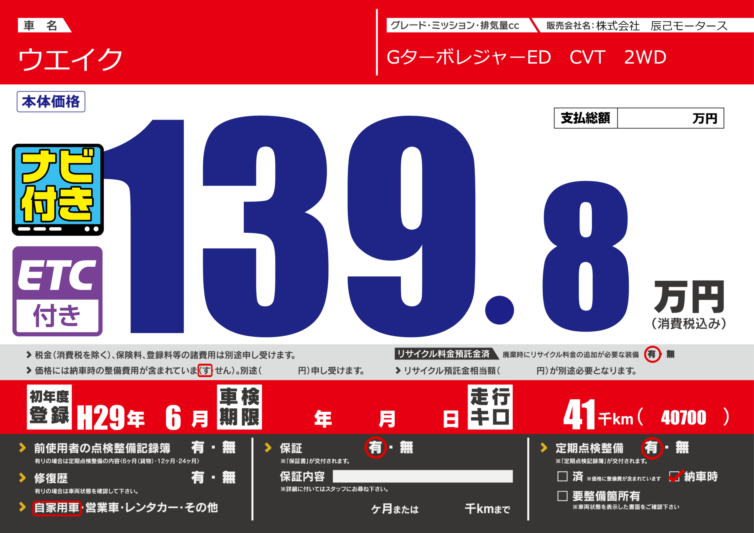 | 走行キロ | 4.1万km | 初年度登録 | H29年6月 |
