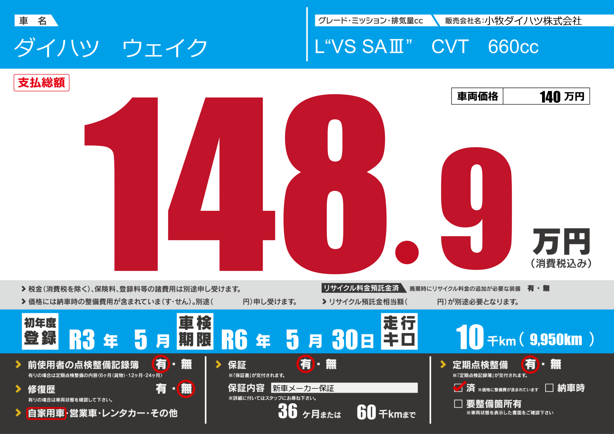 | 定期点検整備 | 定期点検整備あり 定期点検整備済み | ||