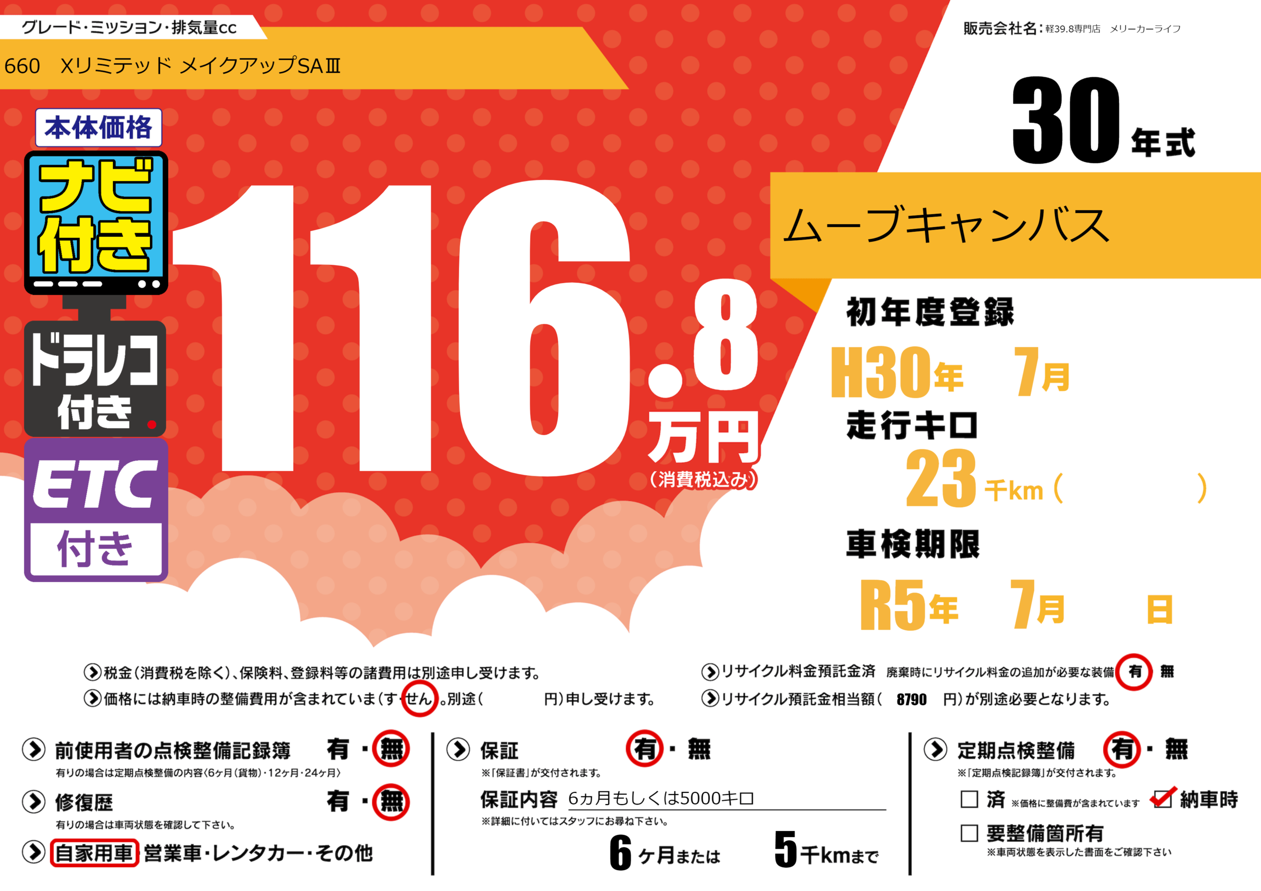 | 走行キロ | 2.3万km | 初年度登録 | H30年7月 |