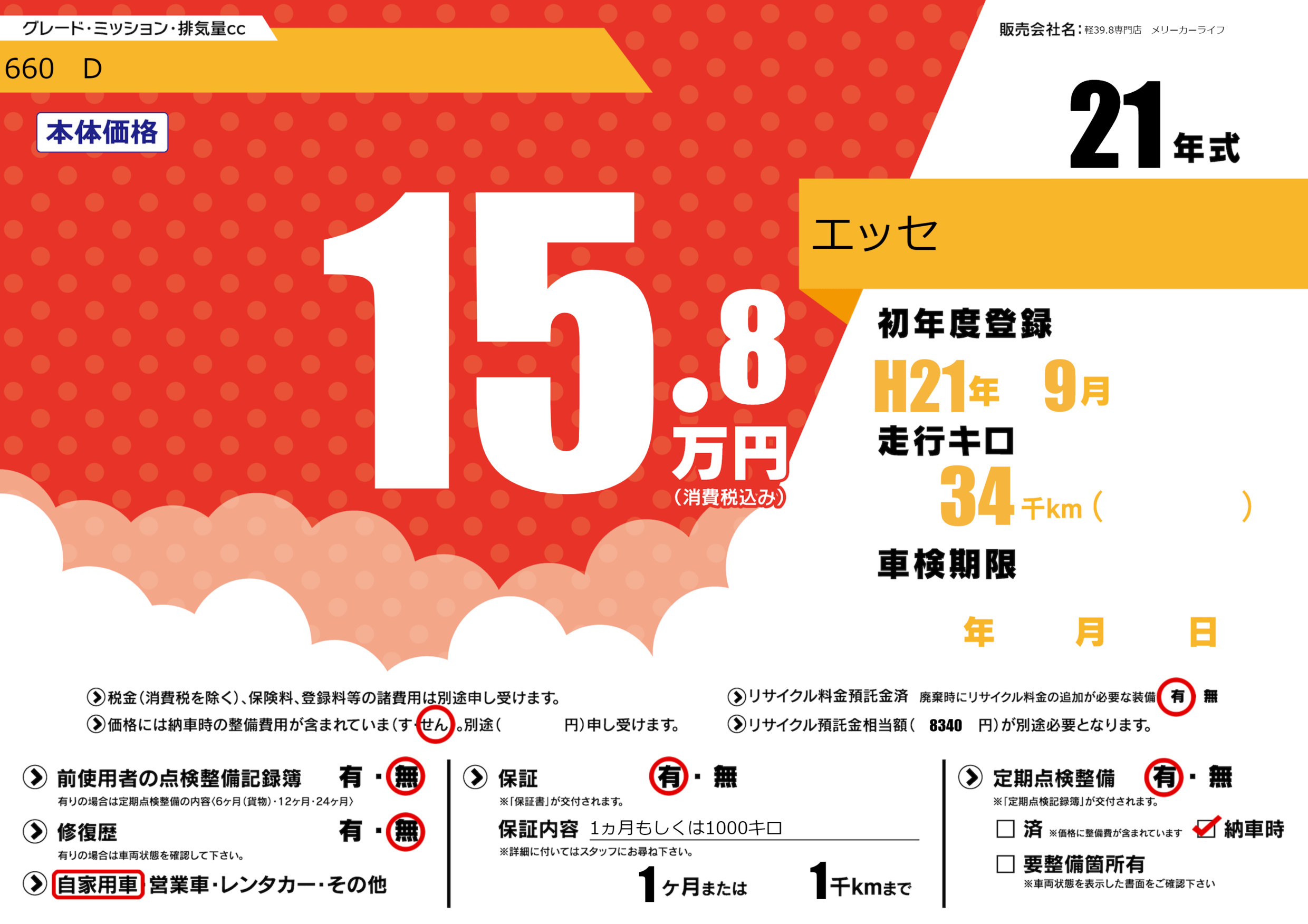 | 定期点検整備 | 定期点検整備あり 納車時あり | ||