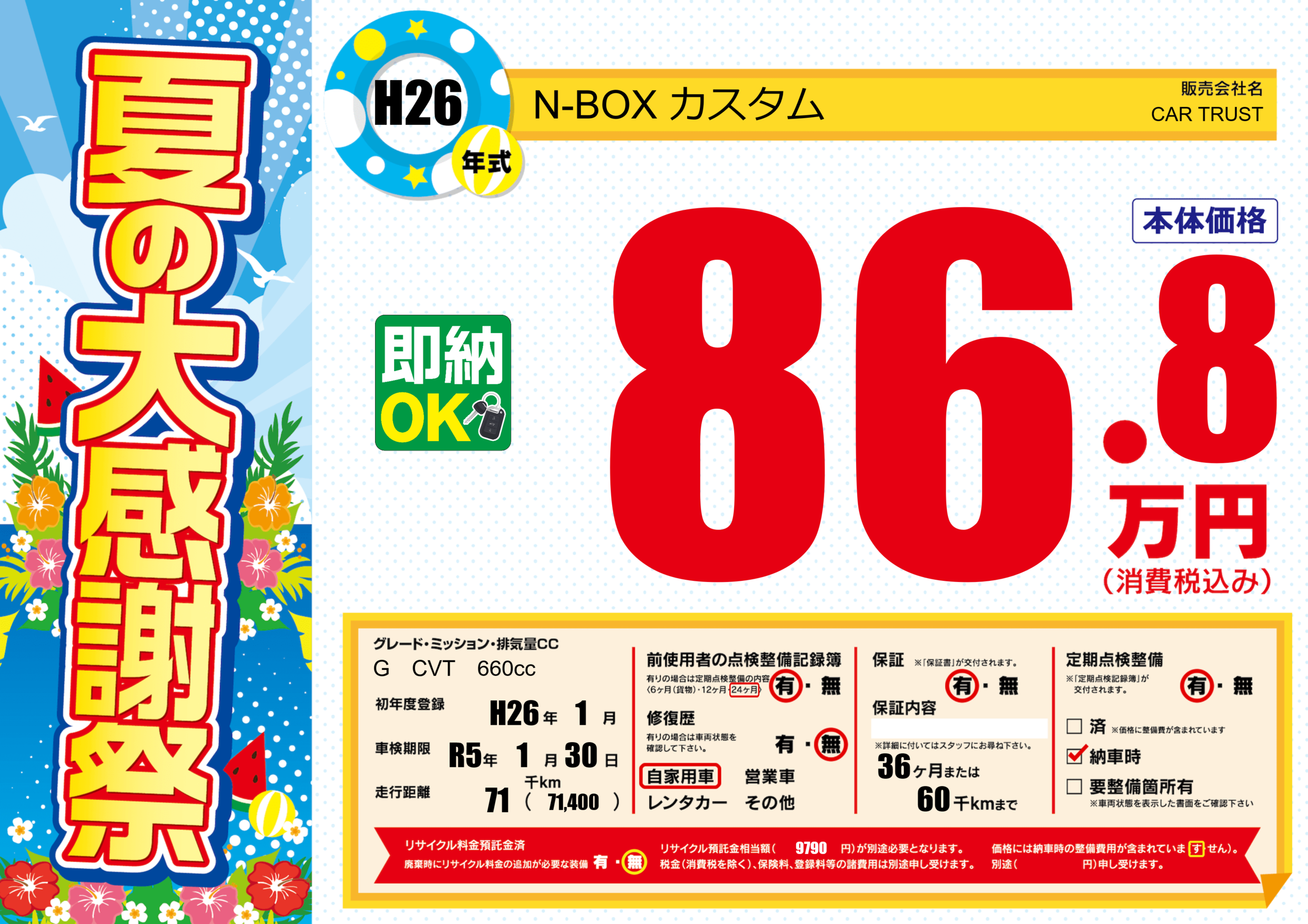 | 定期点検整備 | 定期点検整備あり 納車時あり | ||