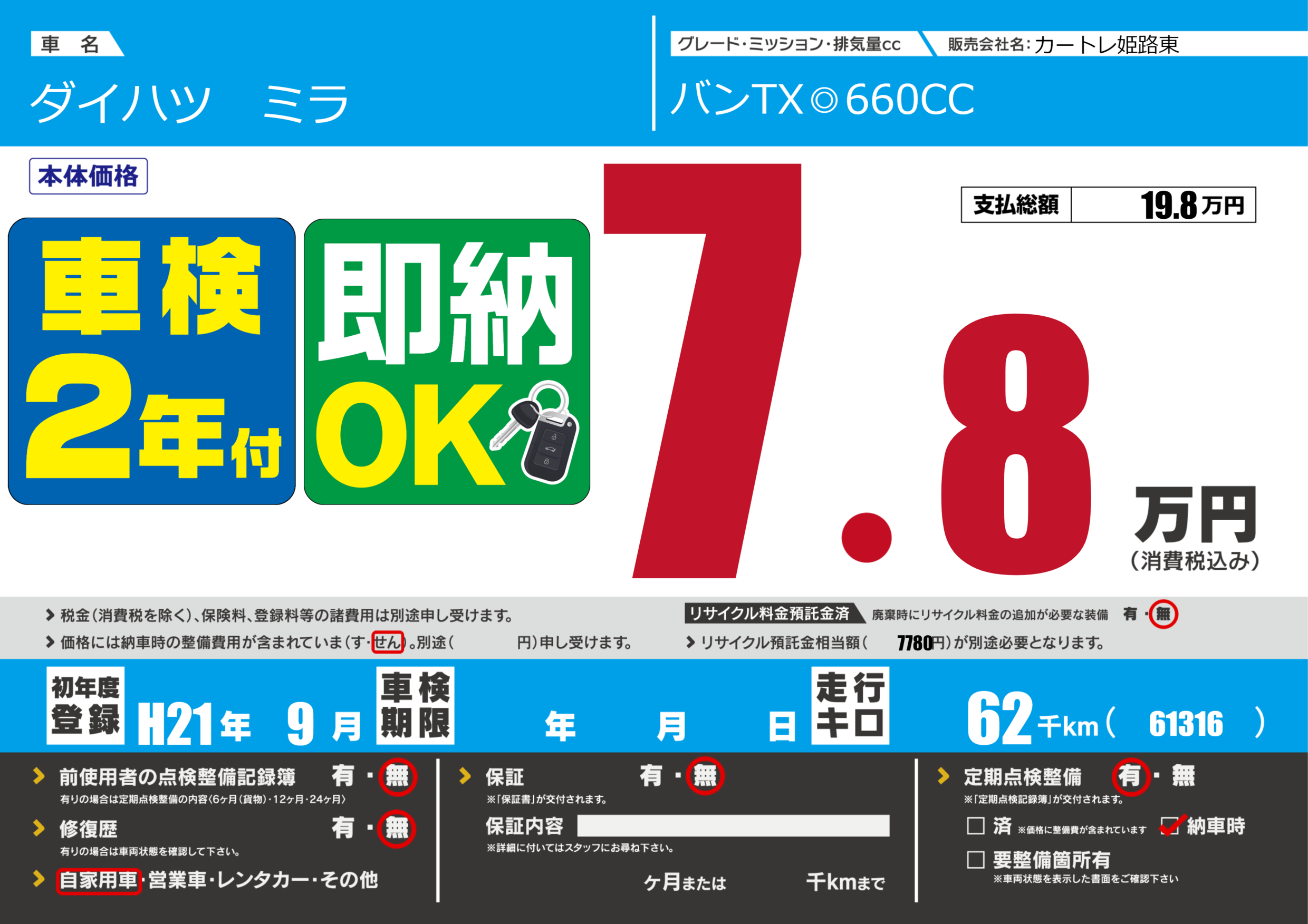 | 走行キロ | 6.2万km | 初年度登録 | H21年9月 |
