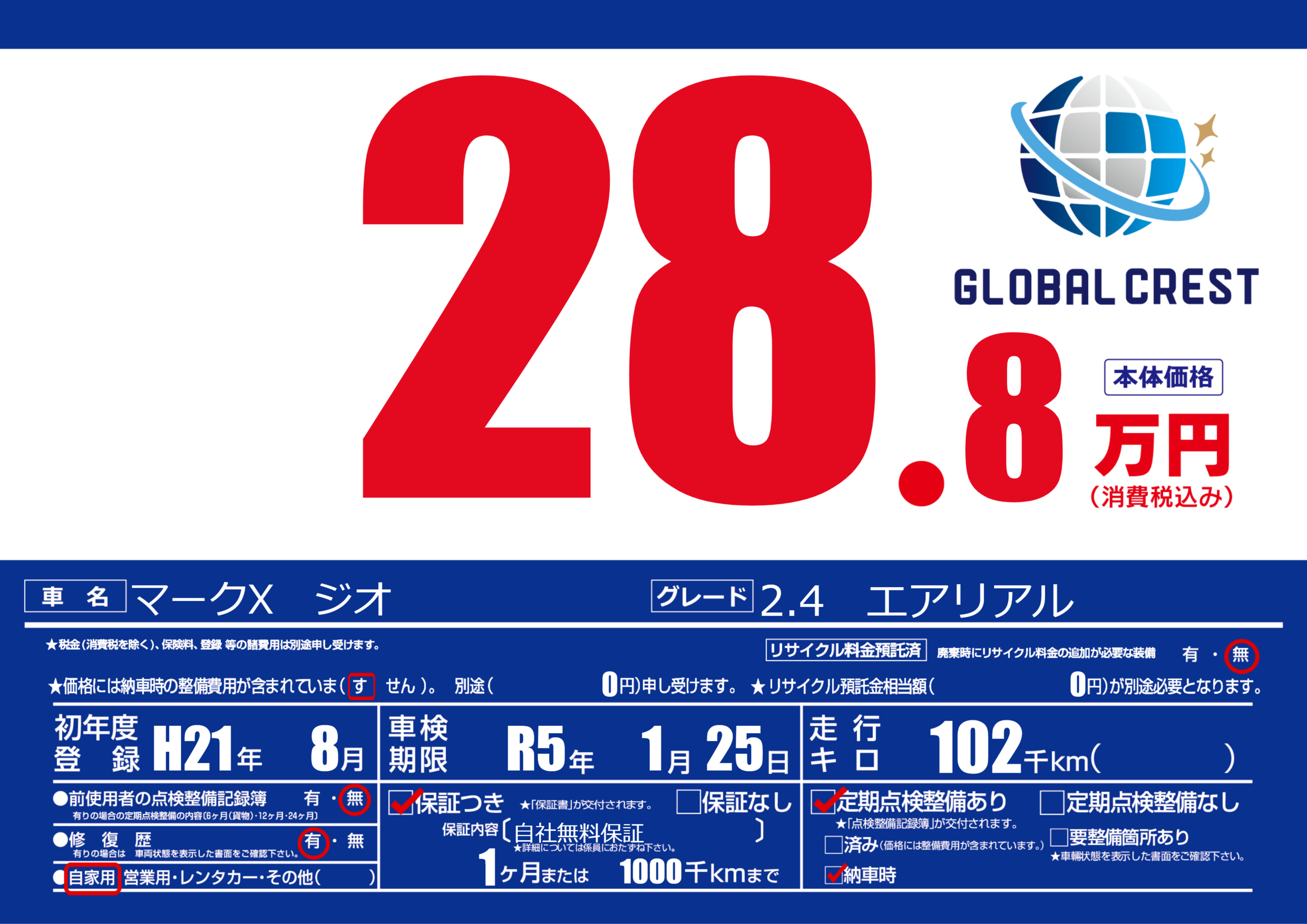 | 車名 | マークX ジオ | グレード ミッション 排気量 |