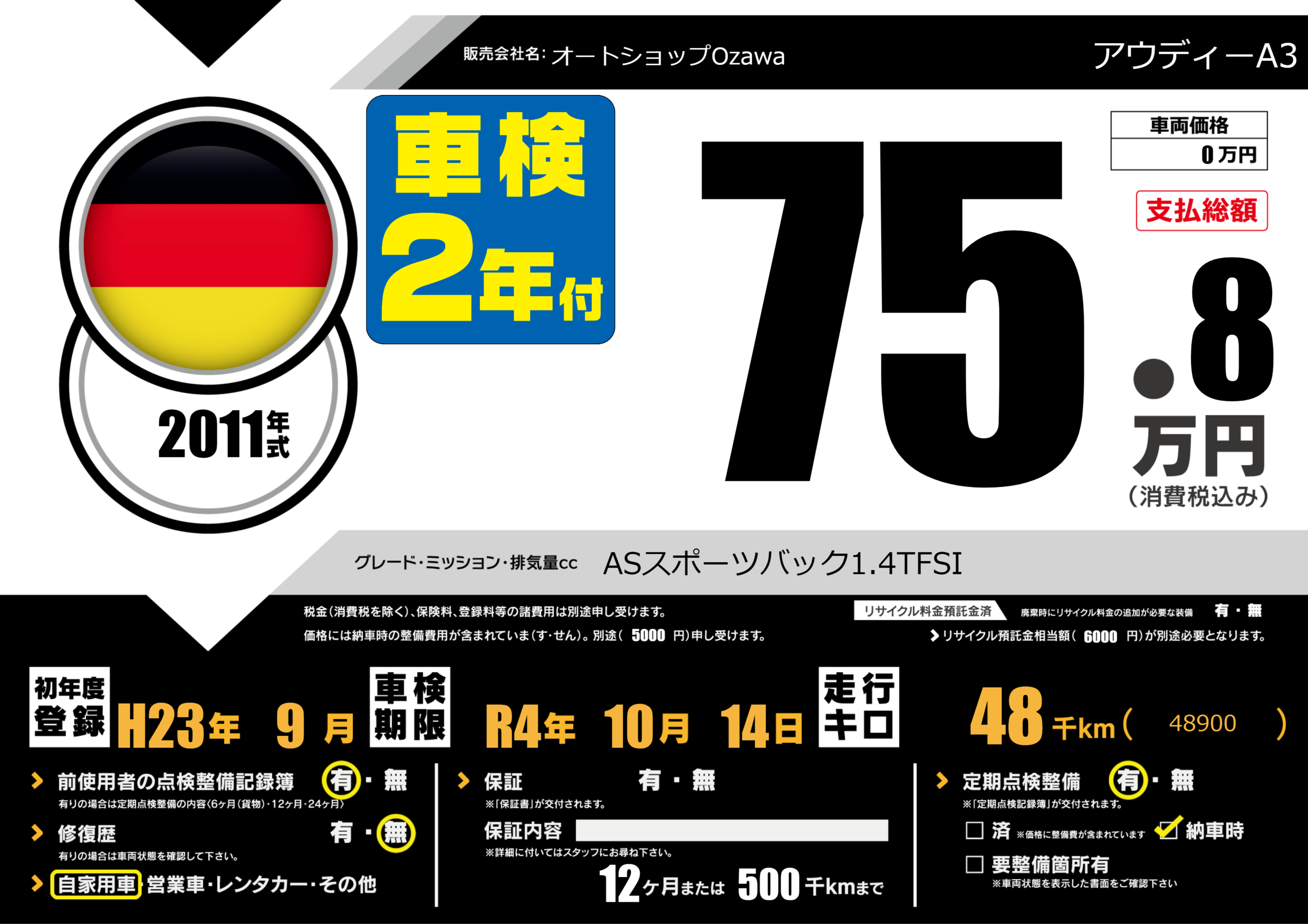 | 車名 | アウディーA3 | グレード ミッション 排気量 |