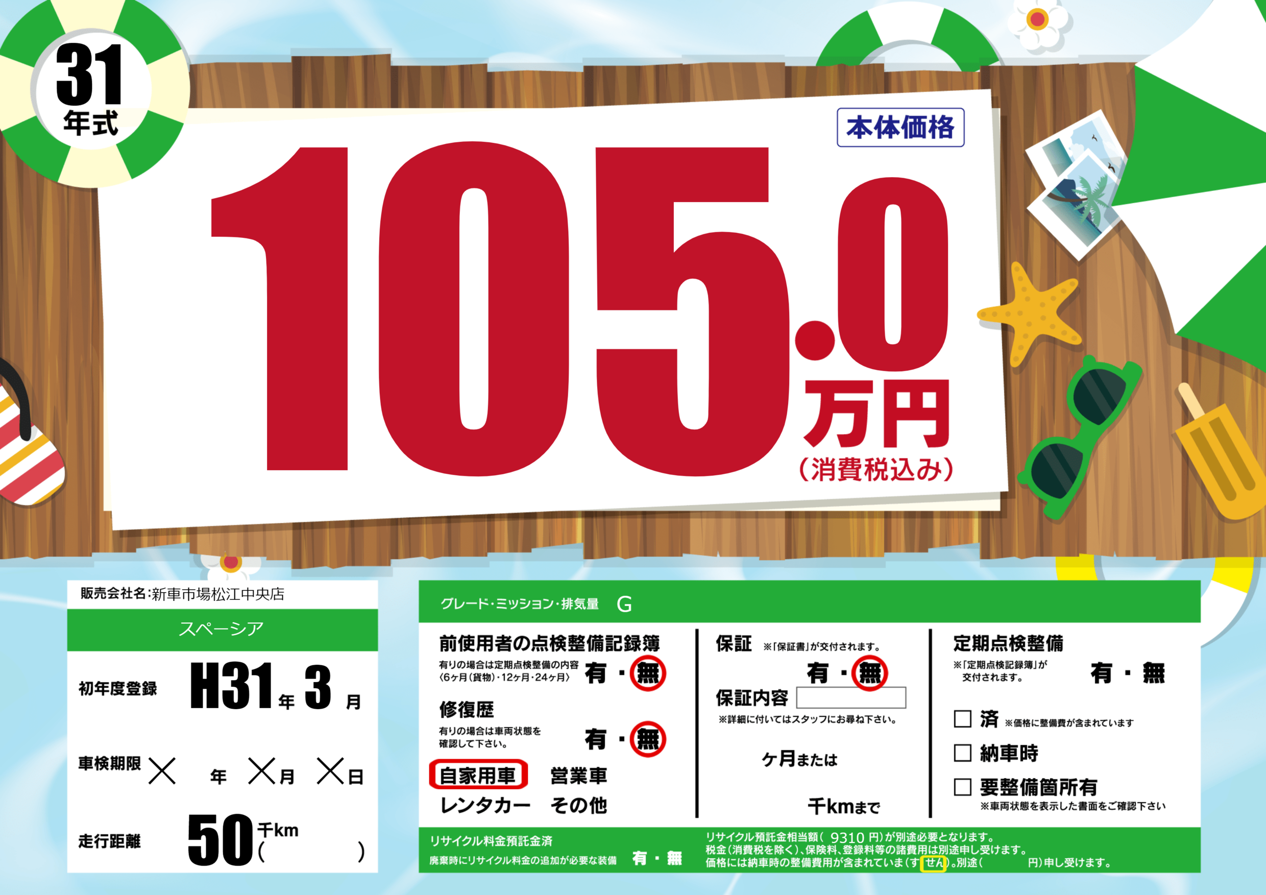 | 走行キロ | 5万km | 初年度登録 | H31年3月 |