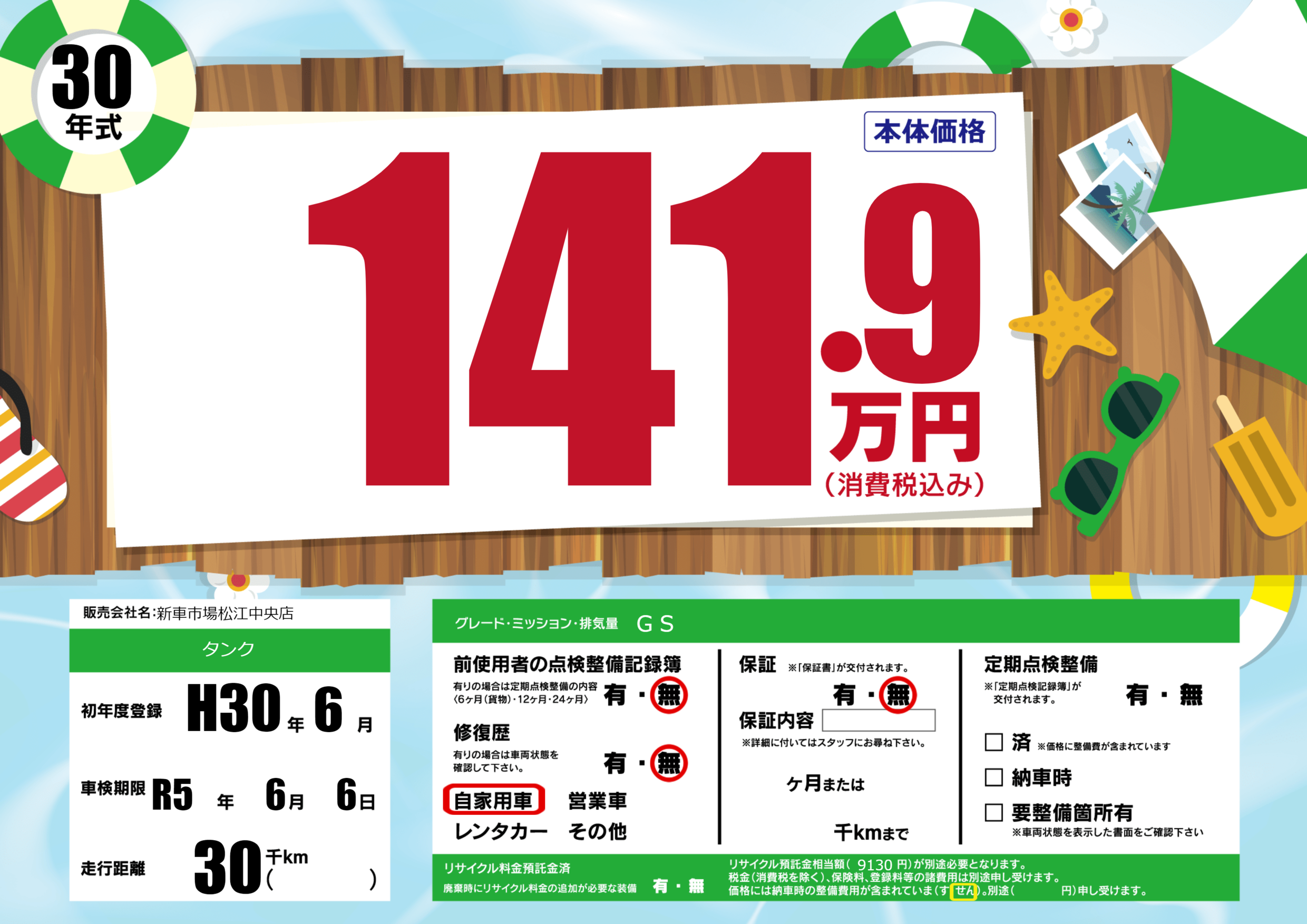 | 走行キロ | 3万km | 初年度登録 | H30年6月 |