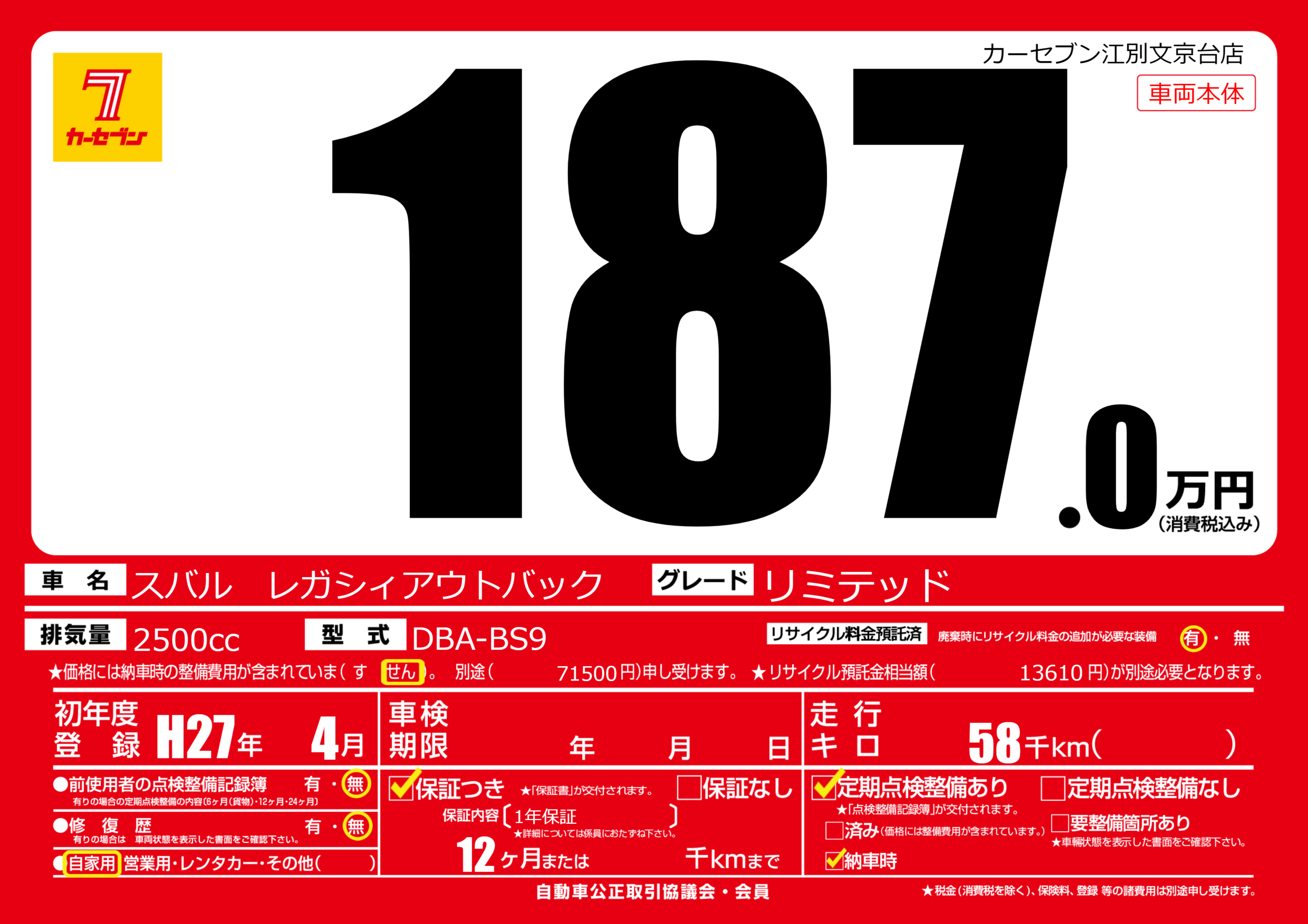 | 車名 | スバル レガシィアウトバック | グレード ミッション 排気量 |