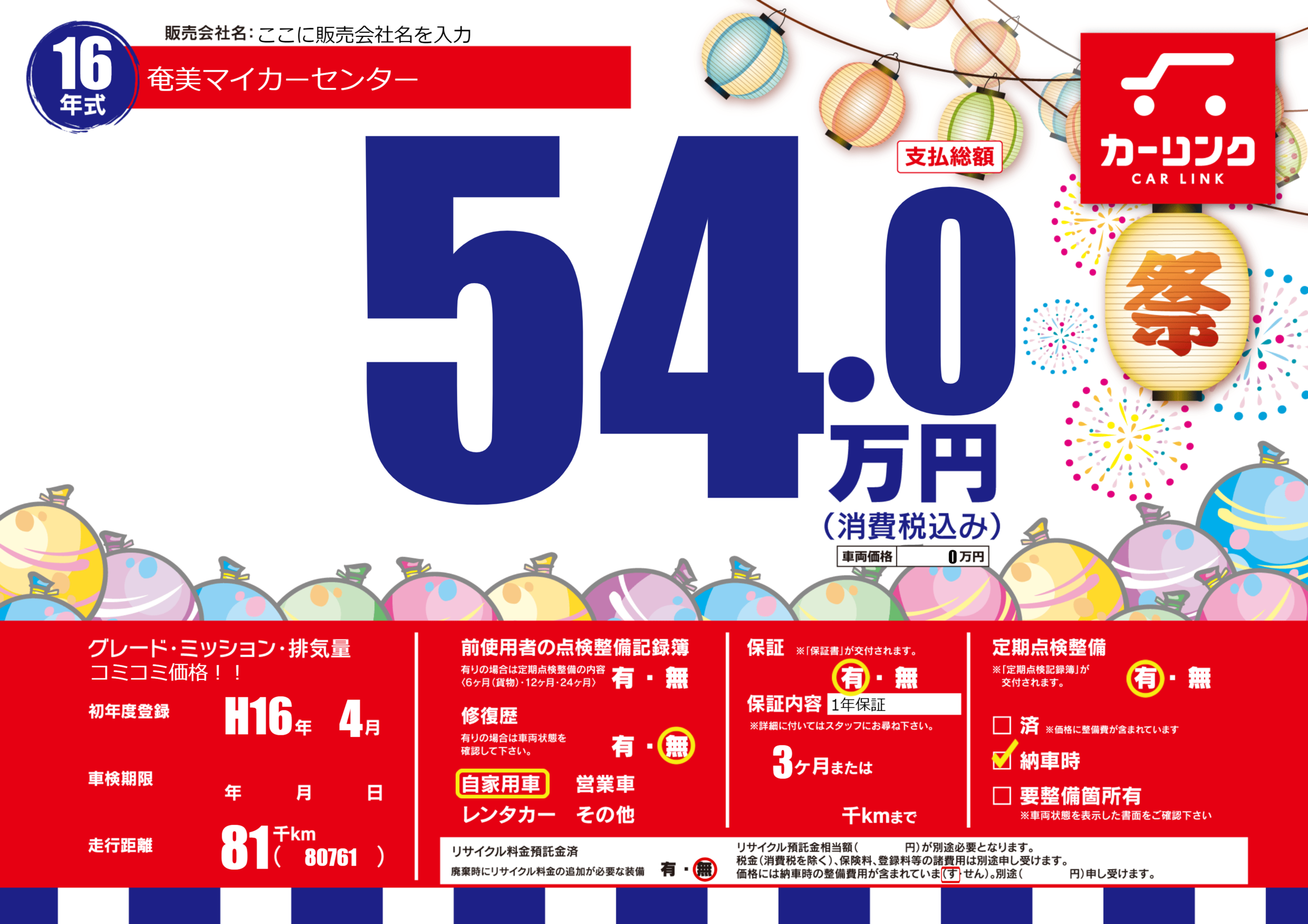 | 車名 | 奄美マイカーセンター | グレード ミッション 排気量 |