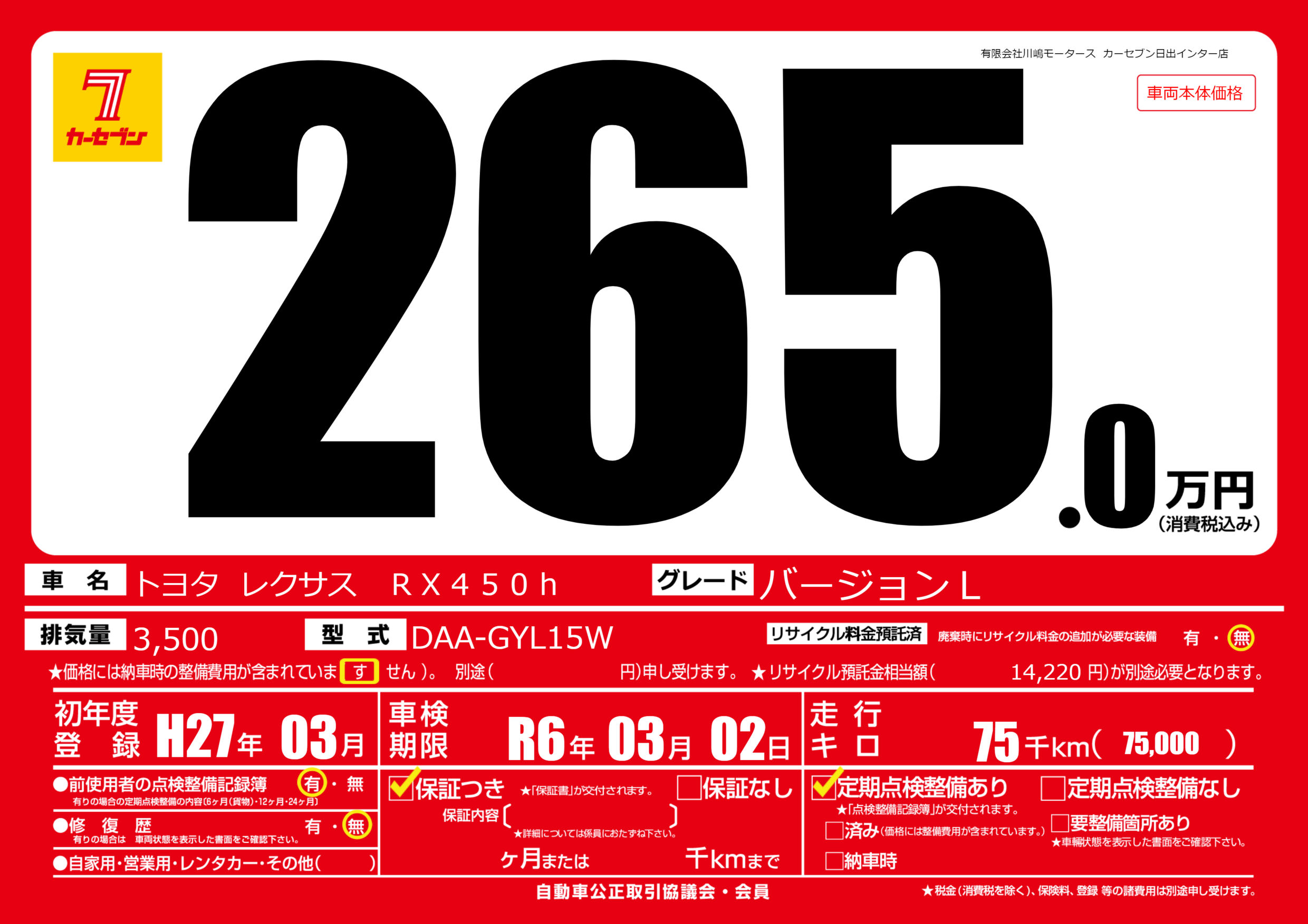 | 車名 | トヨタ レクサス RX450h | グレード ミッション 排気量 |