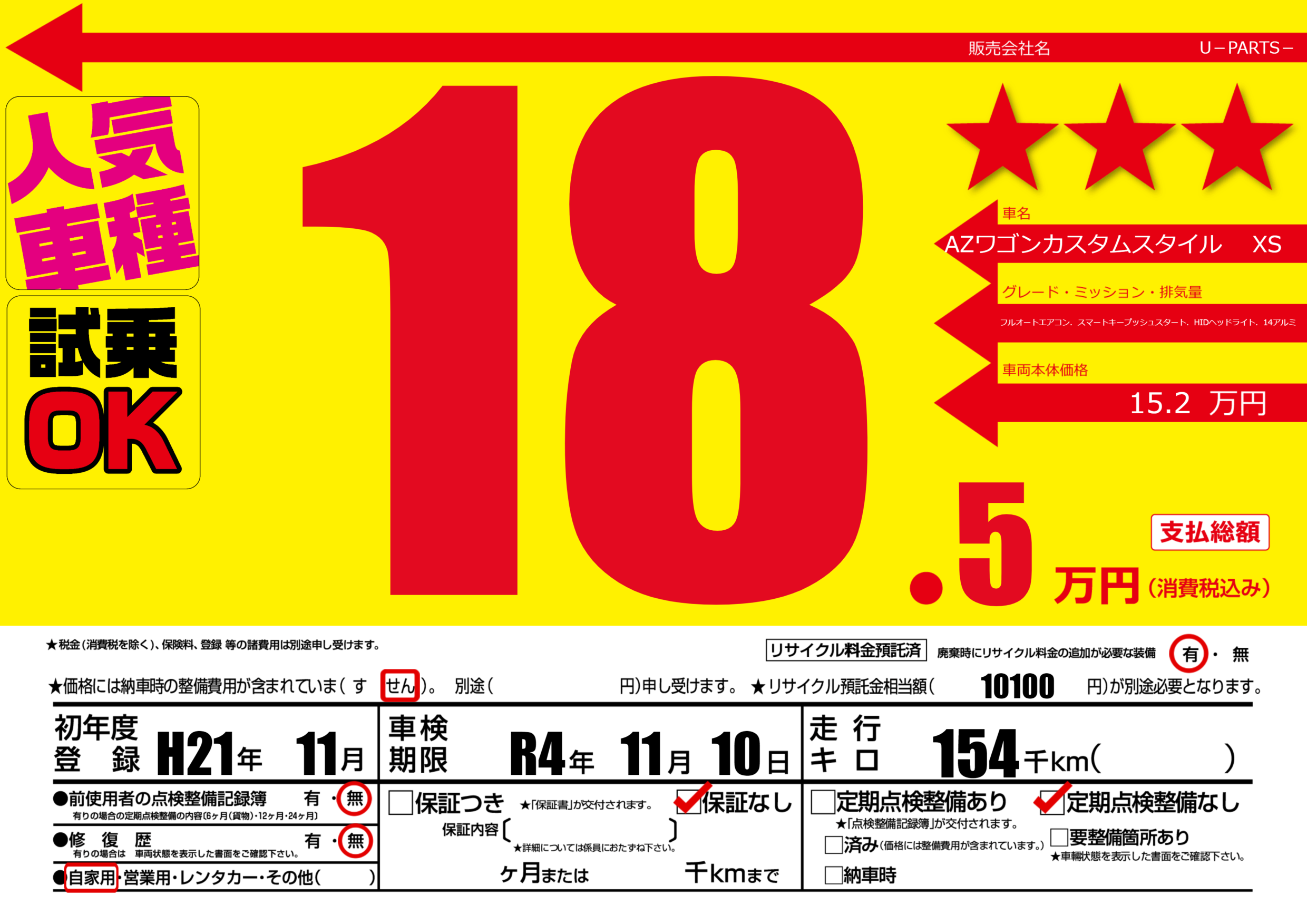 | 走行キロ | 15.4万km | 初年度登録 | H21年11月 |