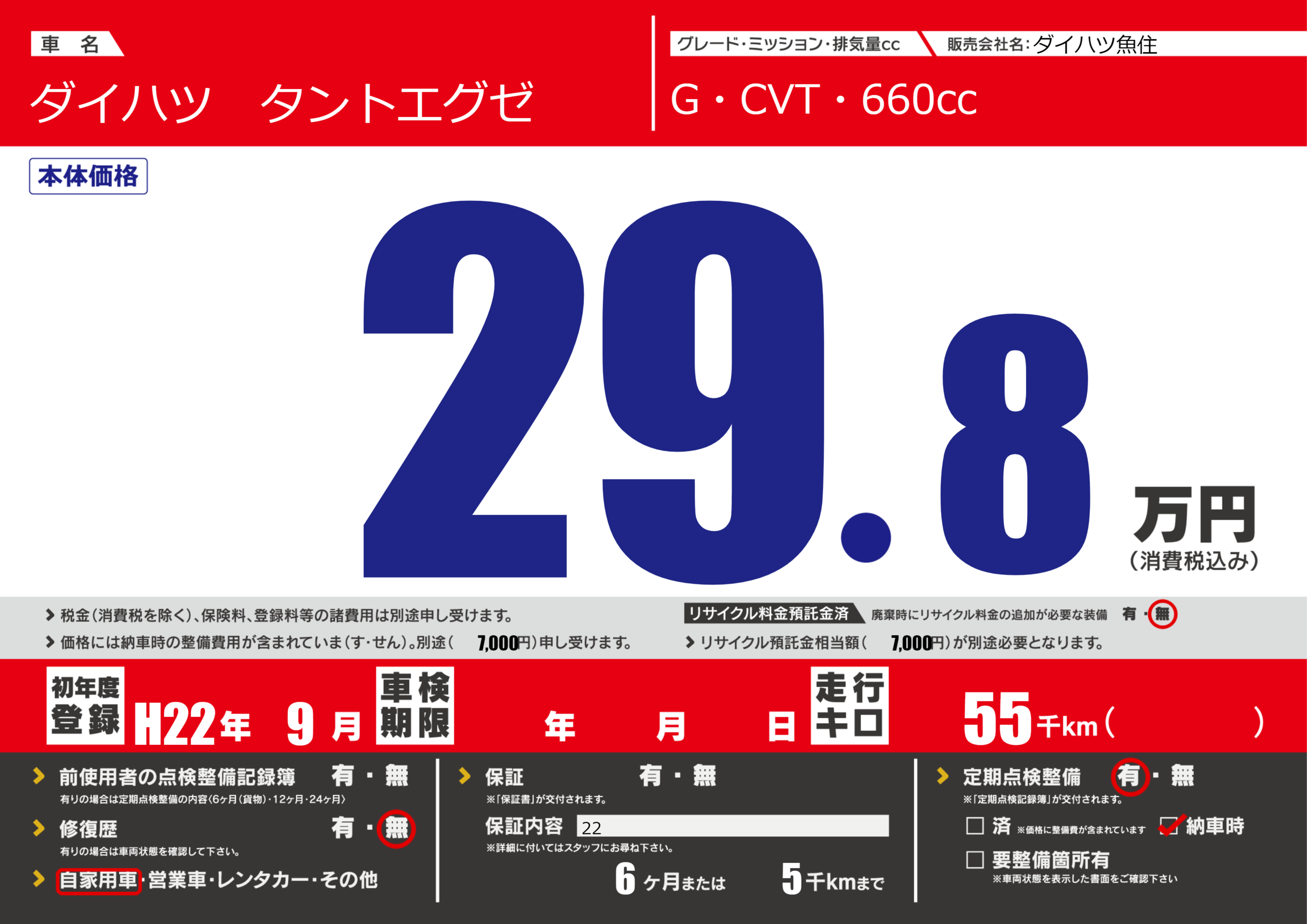 | 車名 | ダイハツ タントエグゼ | グレード ミッション 排気量 |