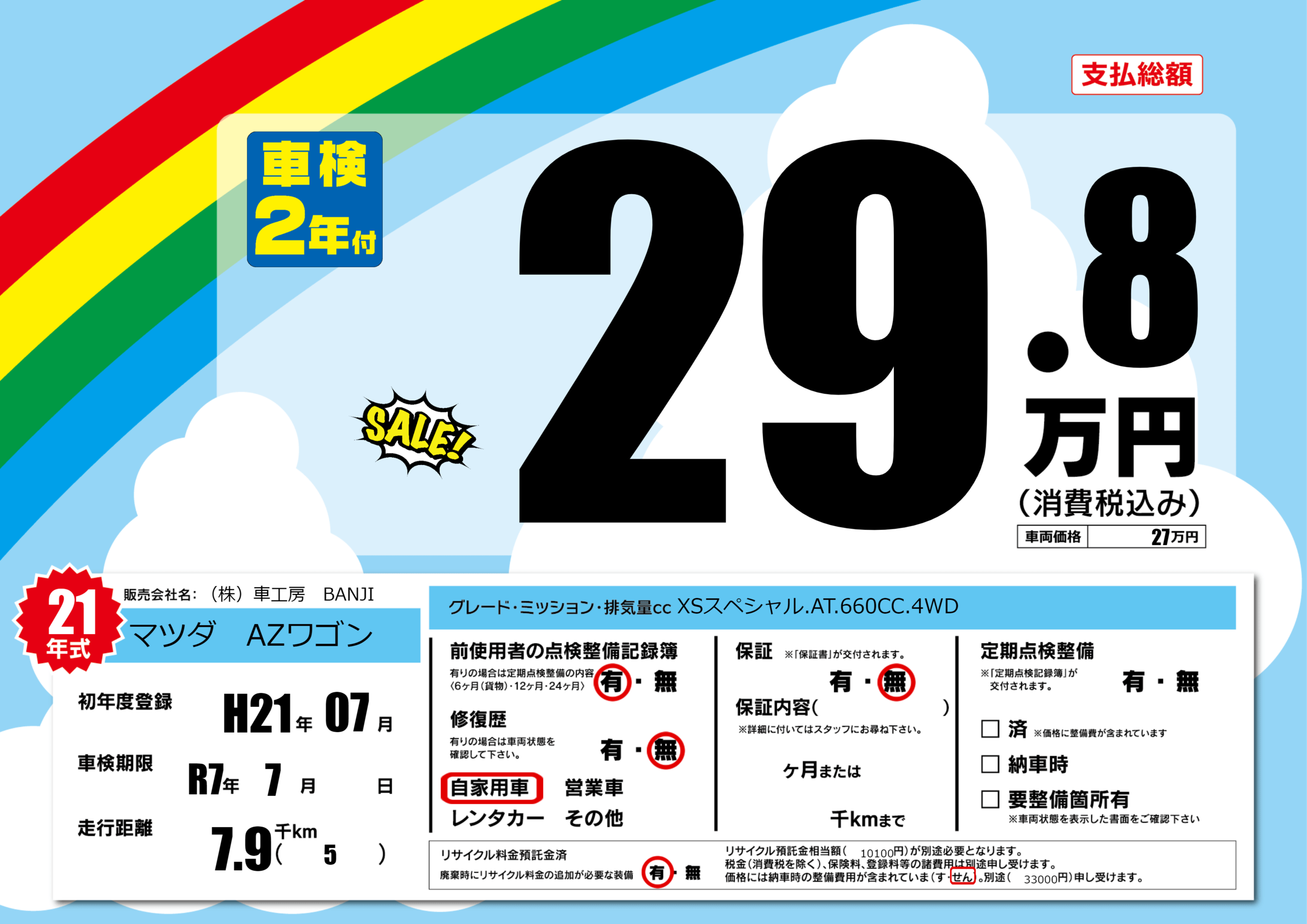 | 車名 | マツダ AZワゴン | グレード ミッション 排気量 |