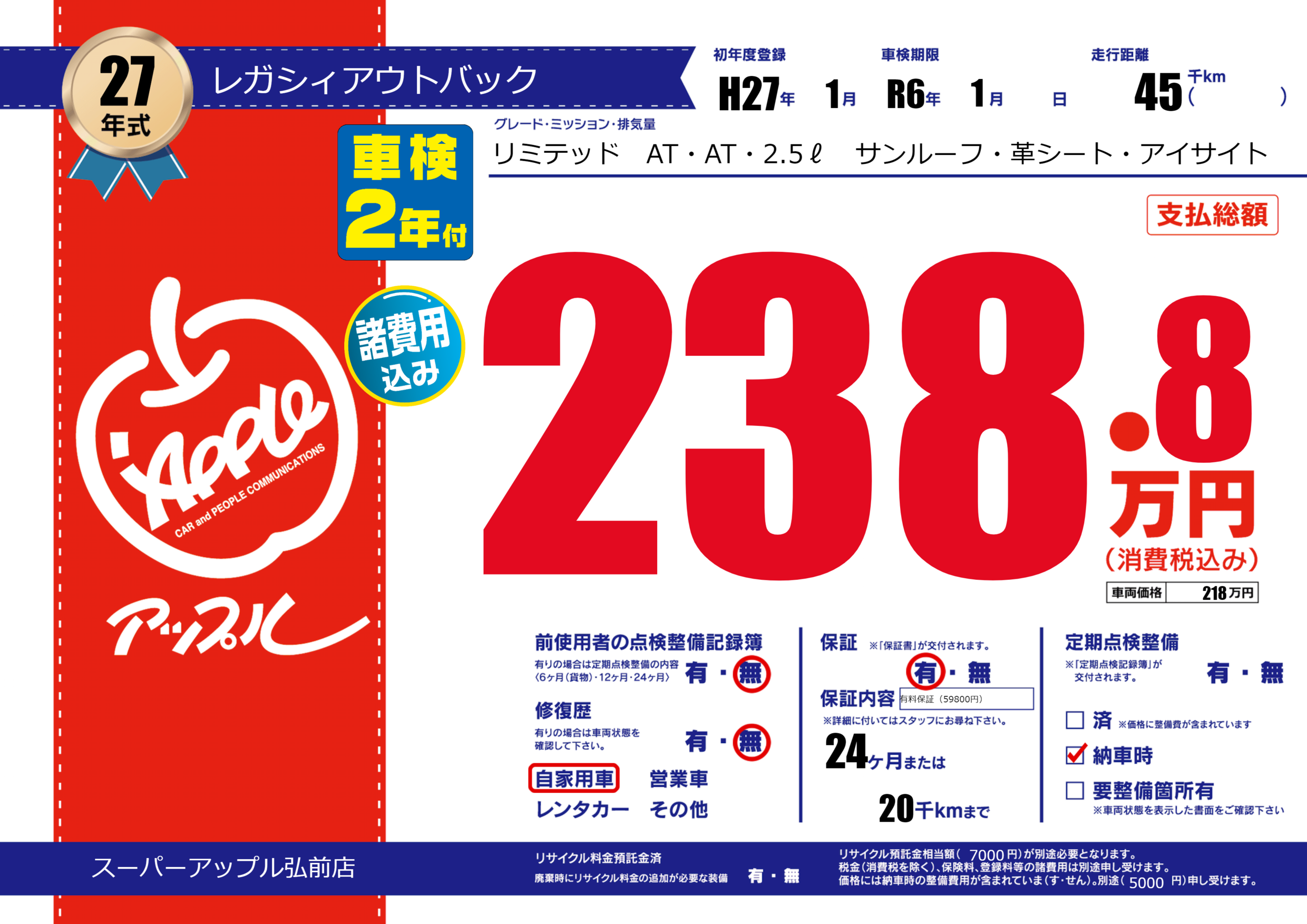 | 車名 | レガシィアウトバック | グレード ミッション 排気量 |
