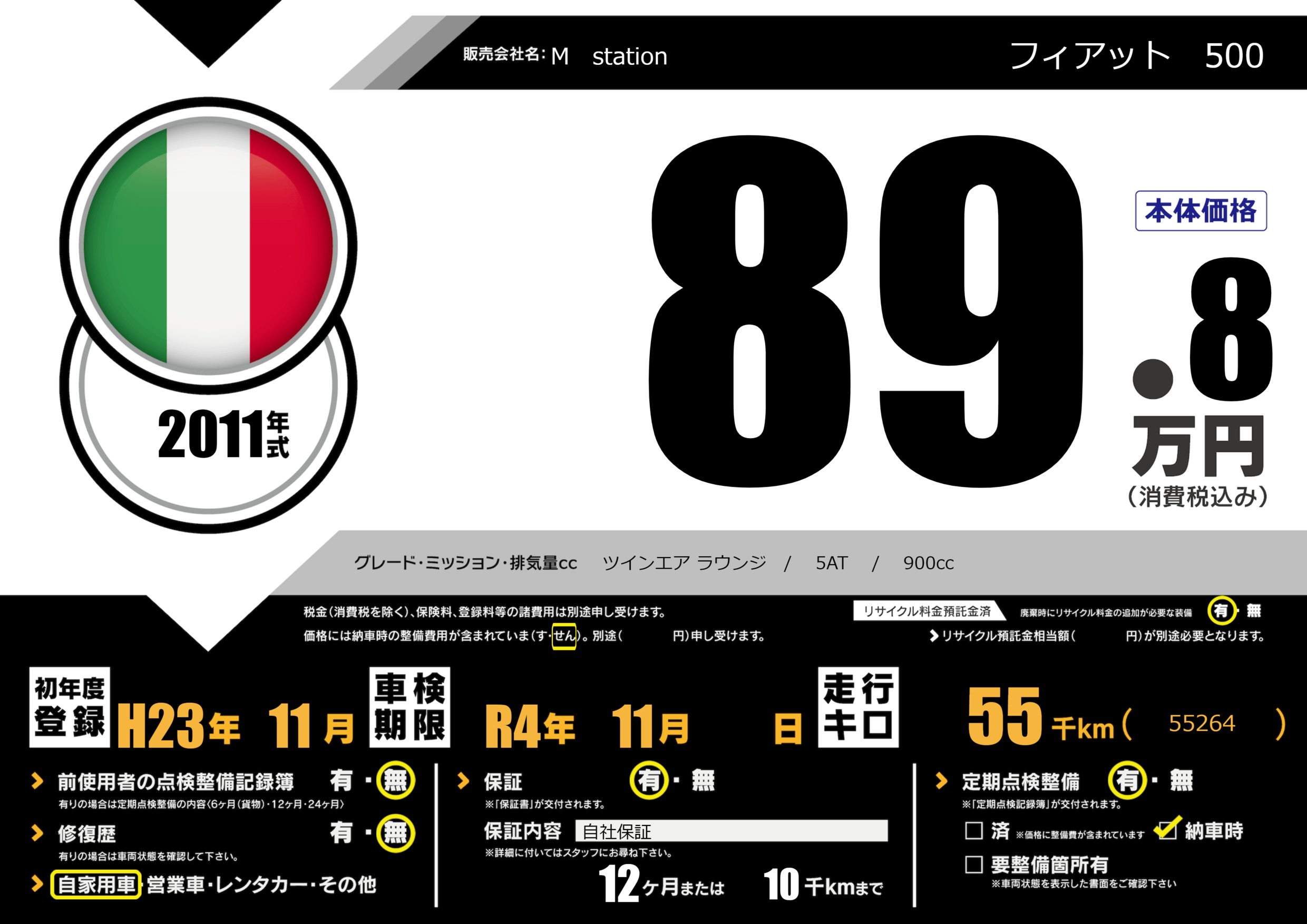 | 車名 | フィアット 500 | グレード ミッション 排気量 |