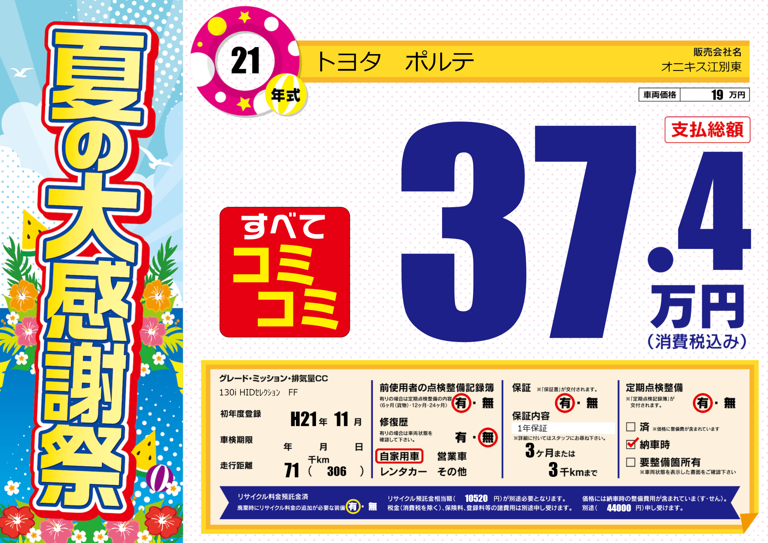 | 車名 | トヨタ ポルテ | グレード ミッション 排気量 |
