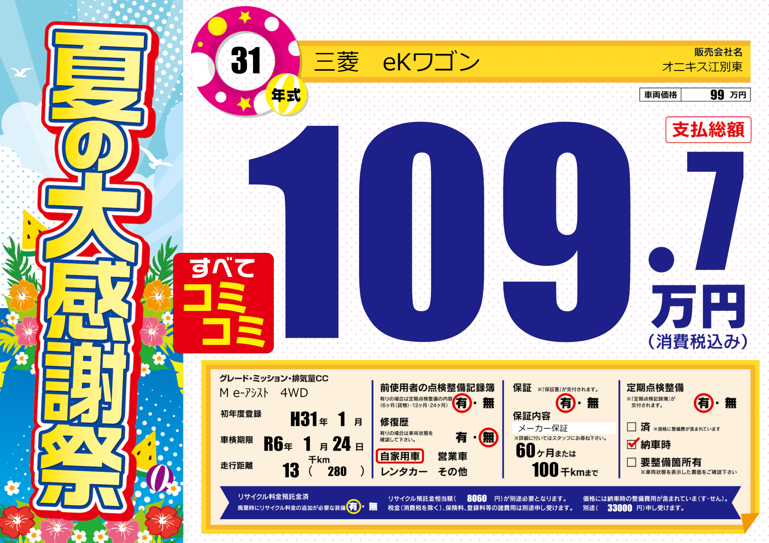 | 車名 | 三菱 eKワゴン | グレード ミッション 排気量 |