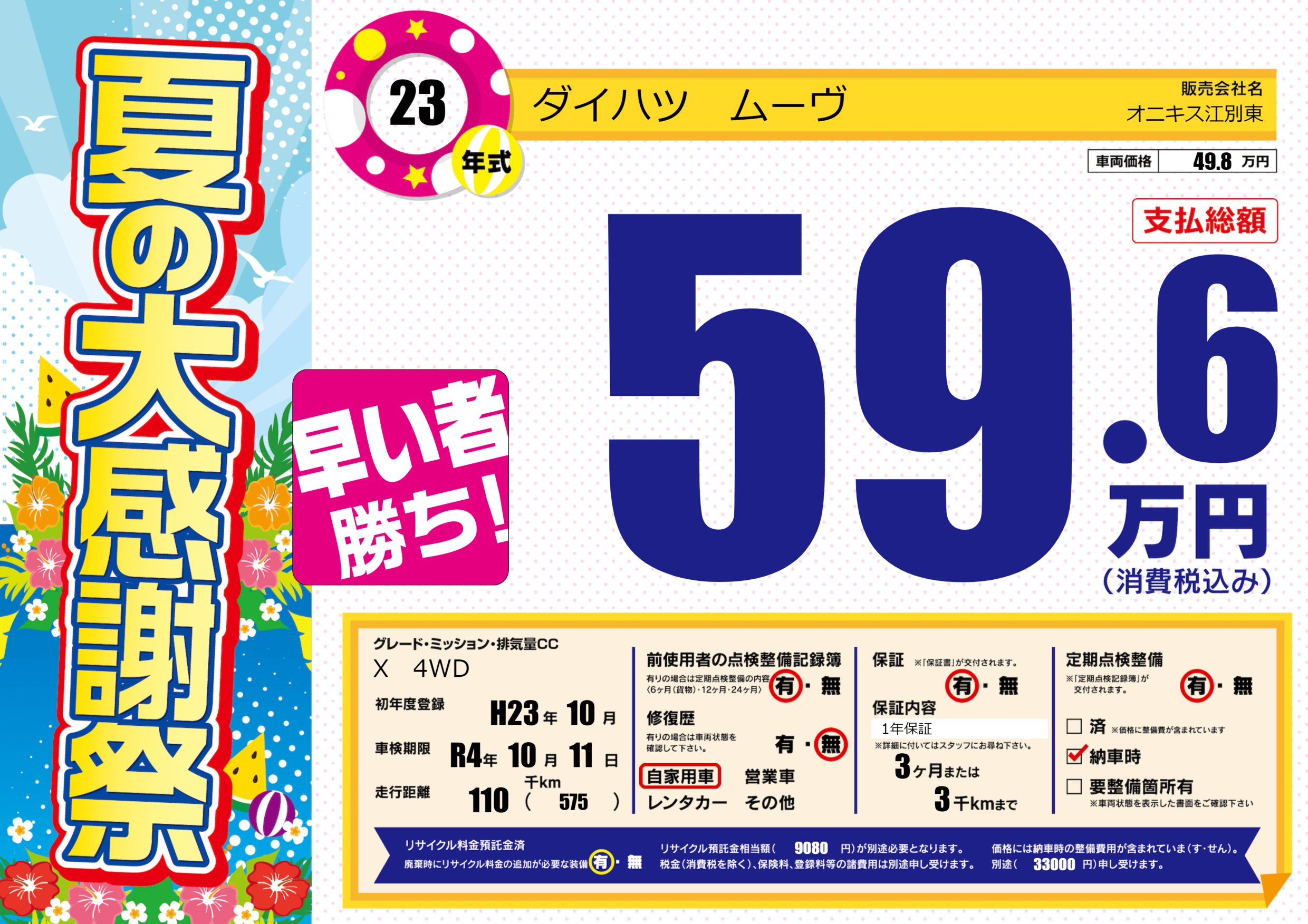 | 走行キロ | 11万km | 初年度登録 | H23年10月 |