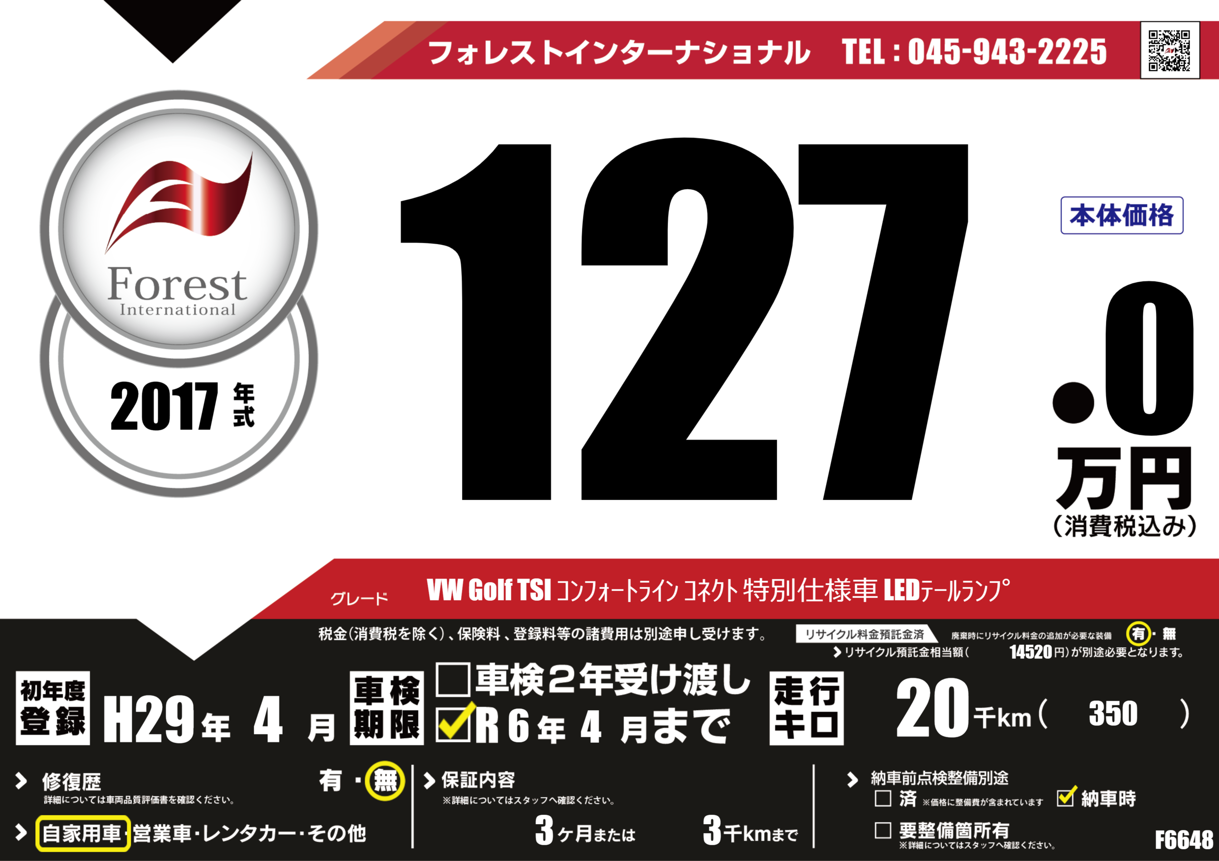 | 走行キロ | 2万km | 初年度登録 | H29年4月 |