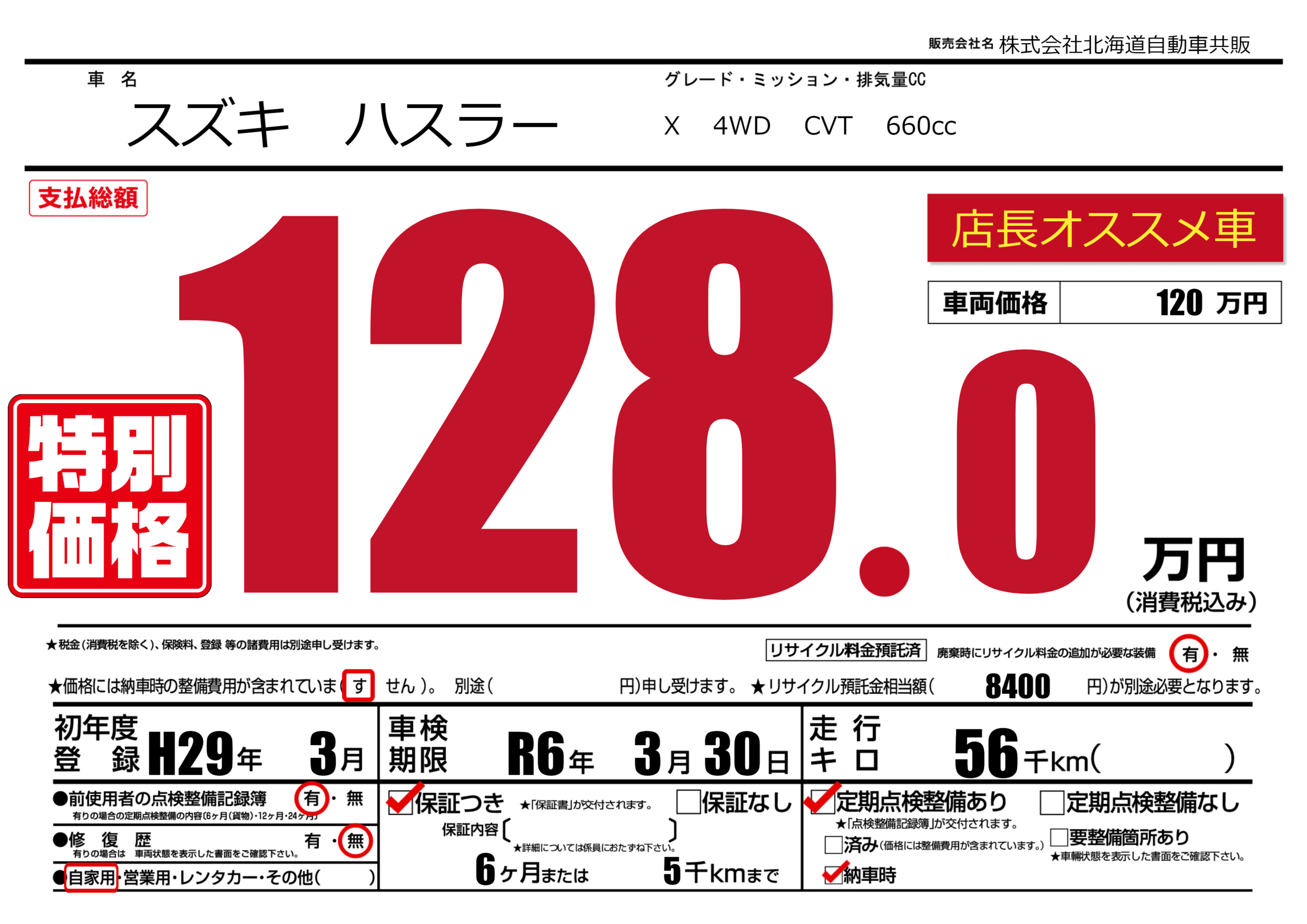 | 車名 | スズキ ハスラー | グレード ミッション 排気量 |