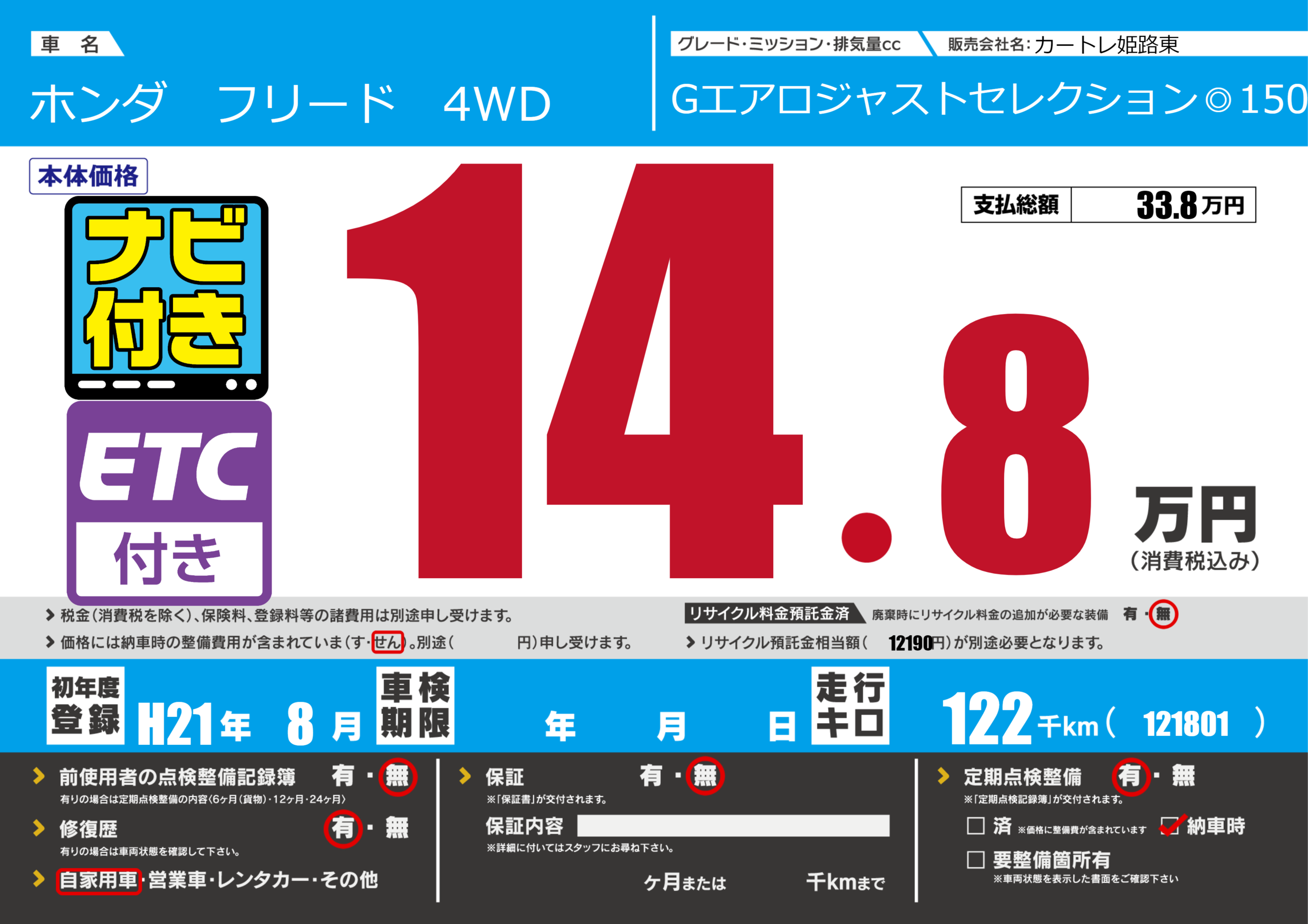 | 車名 | ホンダ フリード 4WD | グレード ミッション 排気量 |