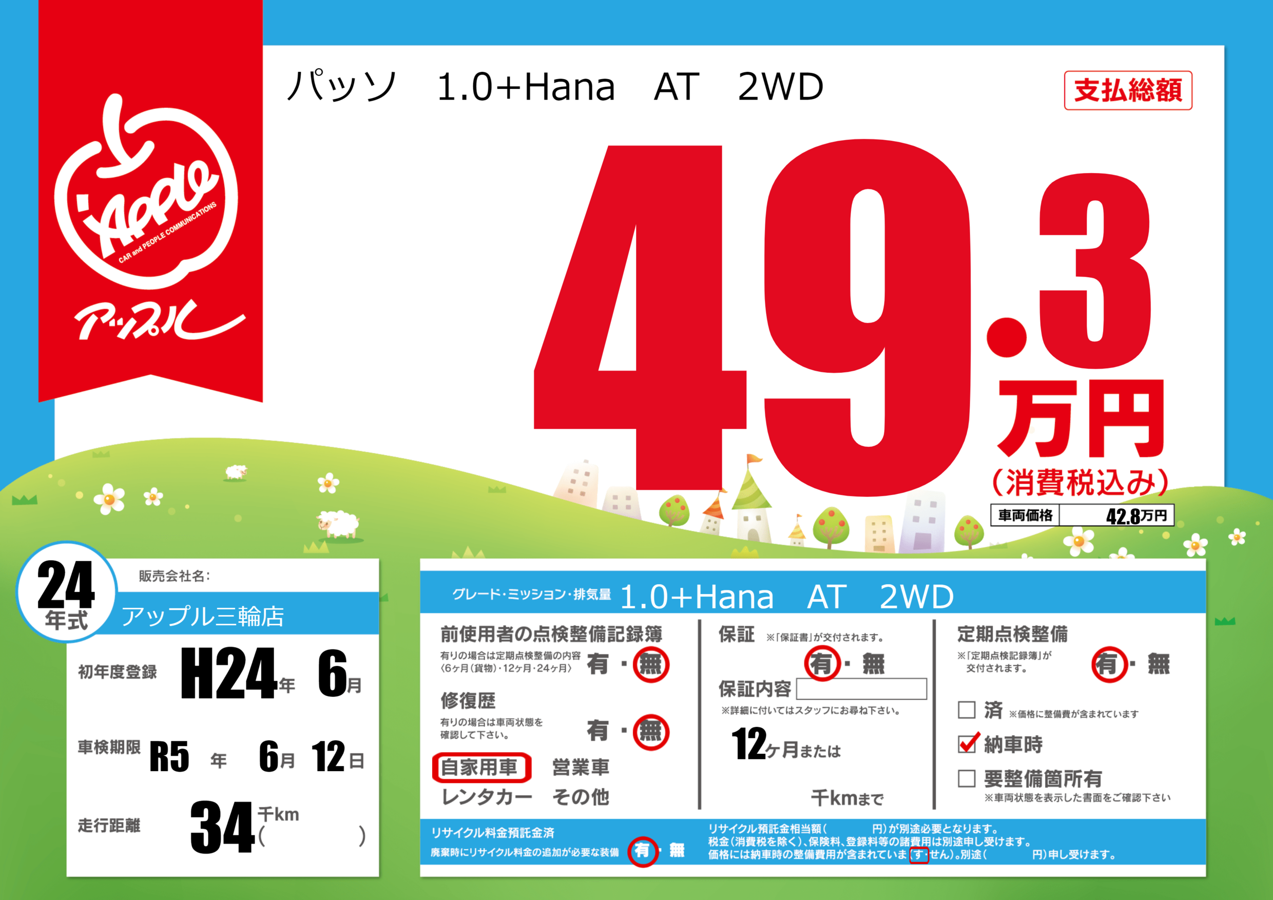 | 車名 | パッソ 1.0+Hana AT 2WD | グレード ミッション 排気量 |