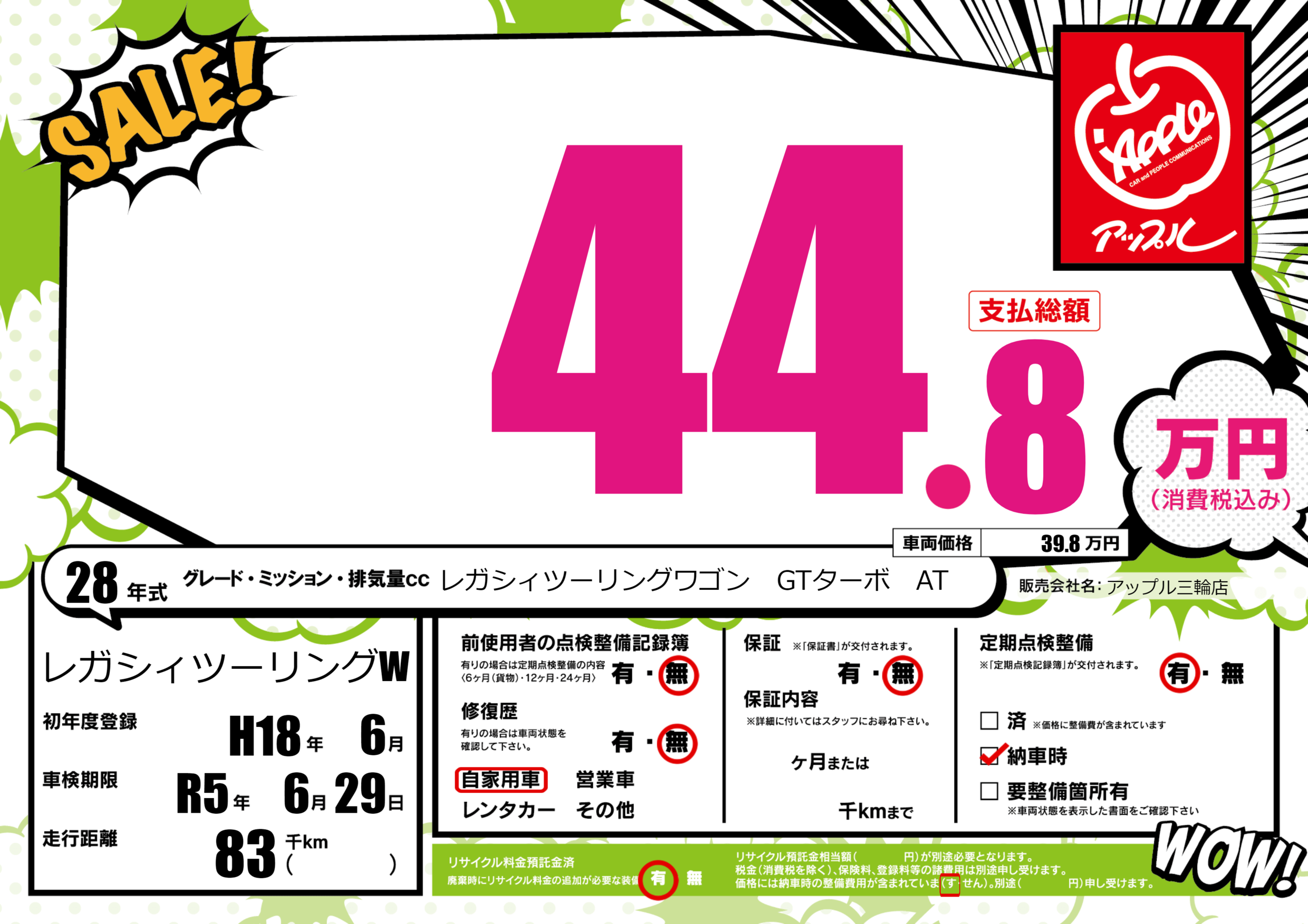 | 車名 | レガシィツーリングW | グレード ミッション 排気量 |
