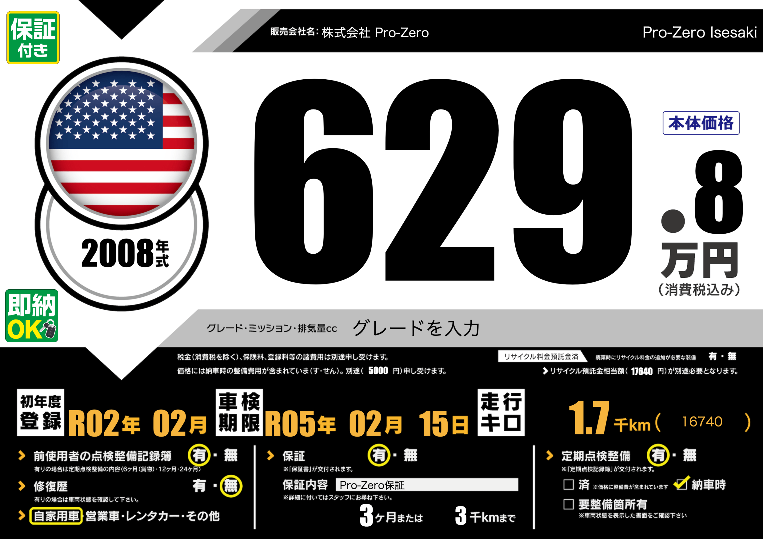| 車名 | Pro-Zero Isesaki | グレード ミッション 排気量 |