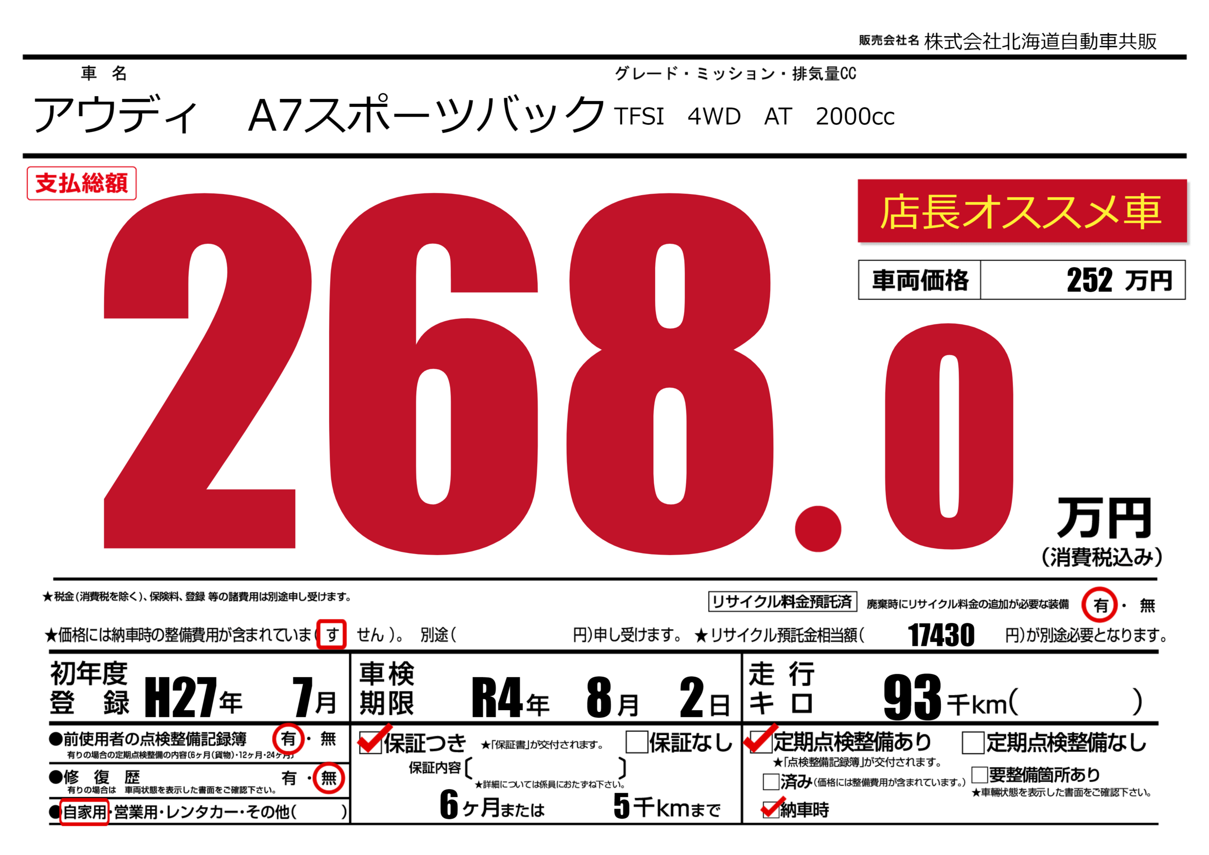 | 走行キロ | 9.3万km | 初年度登録 | H27年7月 |