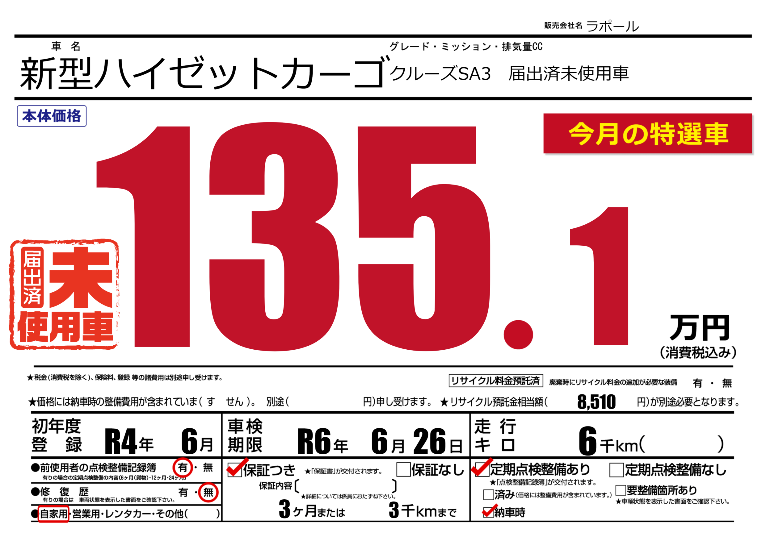 | 走行キロ | 0.6万km | 初年度登録 | R4年6月 |