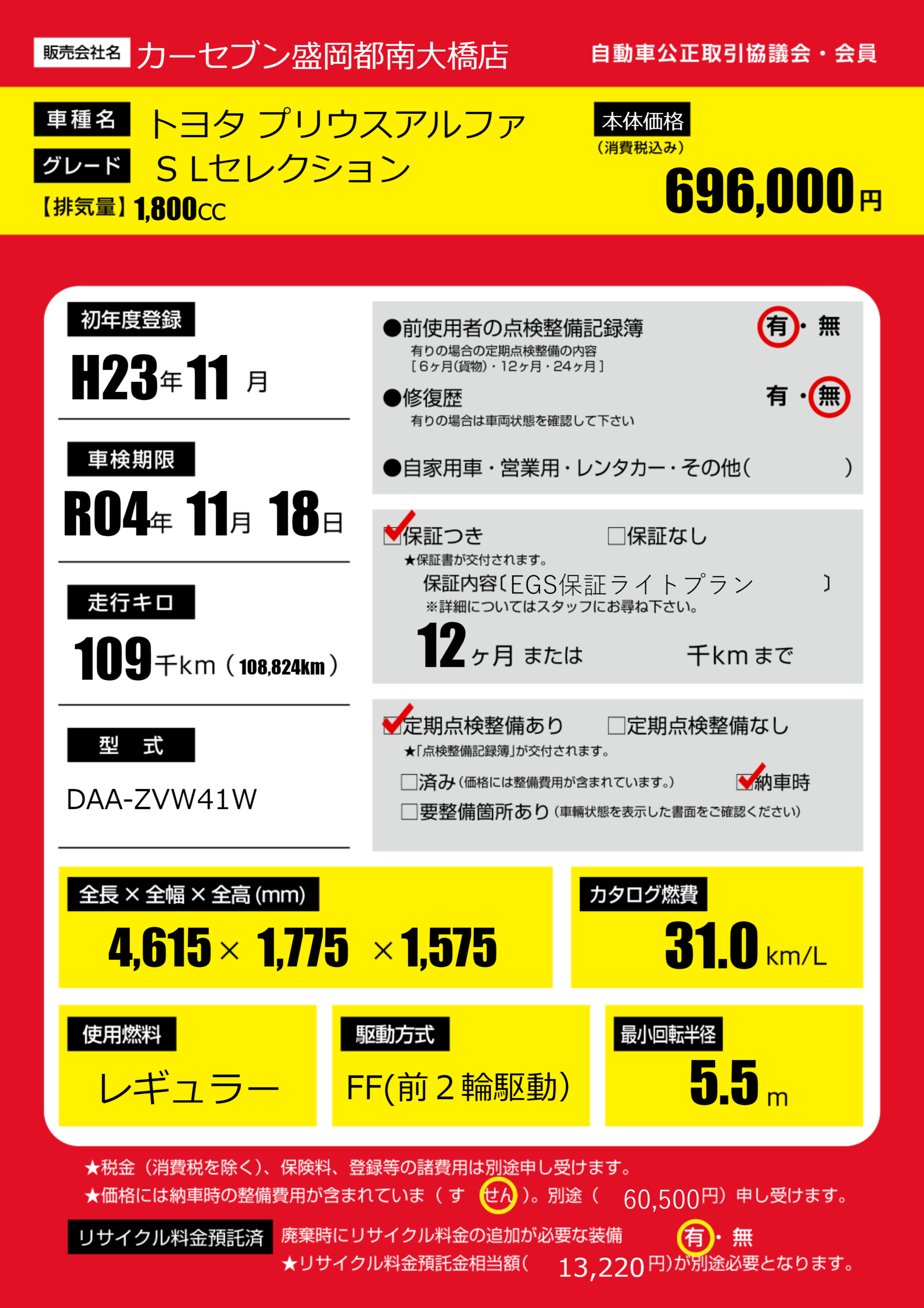 | 車名 | トヨタ プリウスアルファ | グレード ミッション 排気量 |