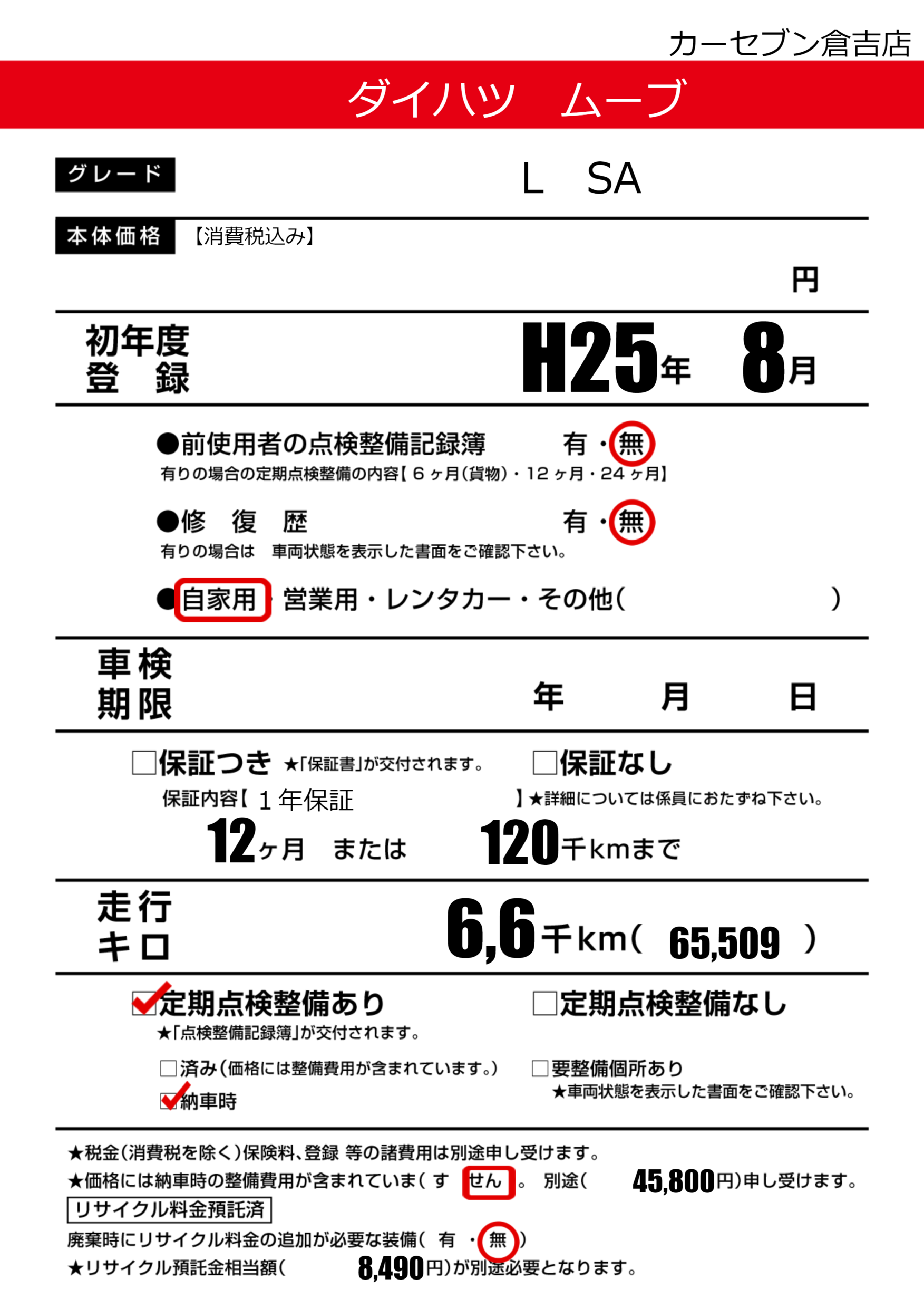 | 初年度登録 | H25年8月 | ||