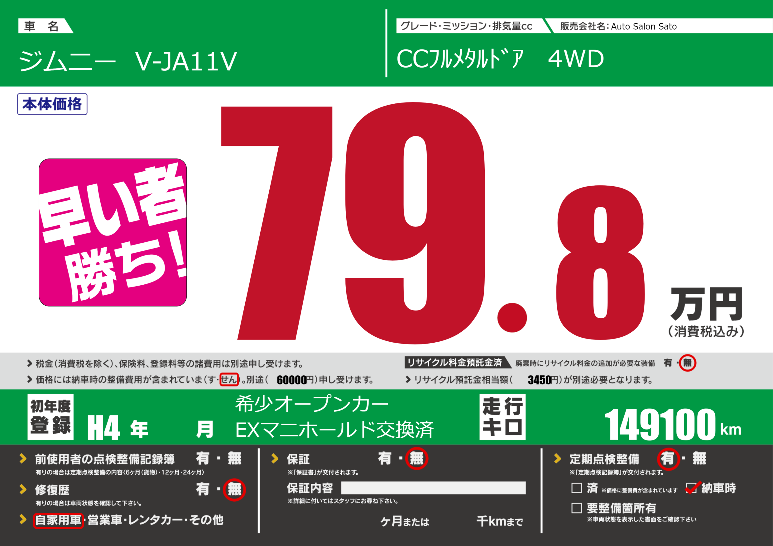| 走行キロ | 14910万km | 初年度登録 | H4年---月 |