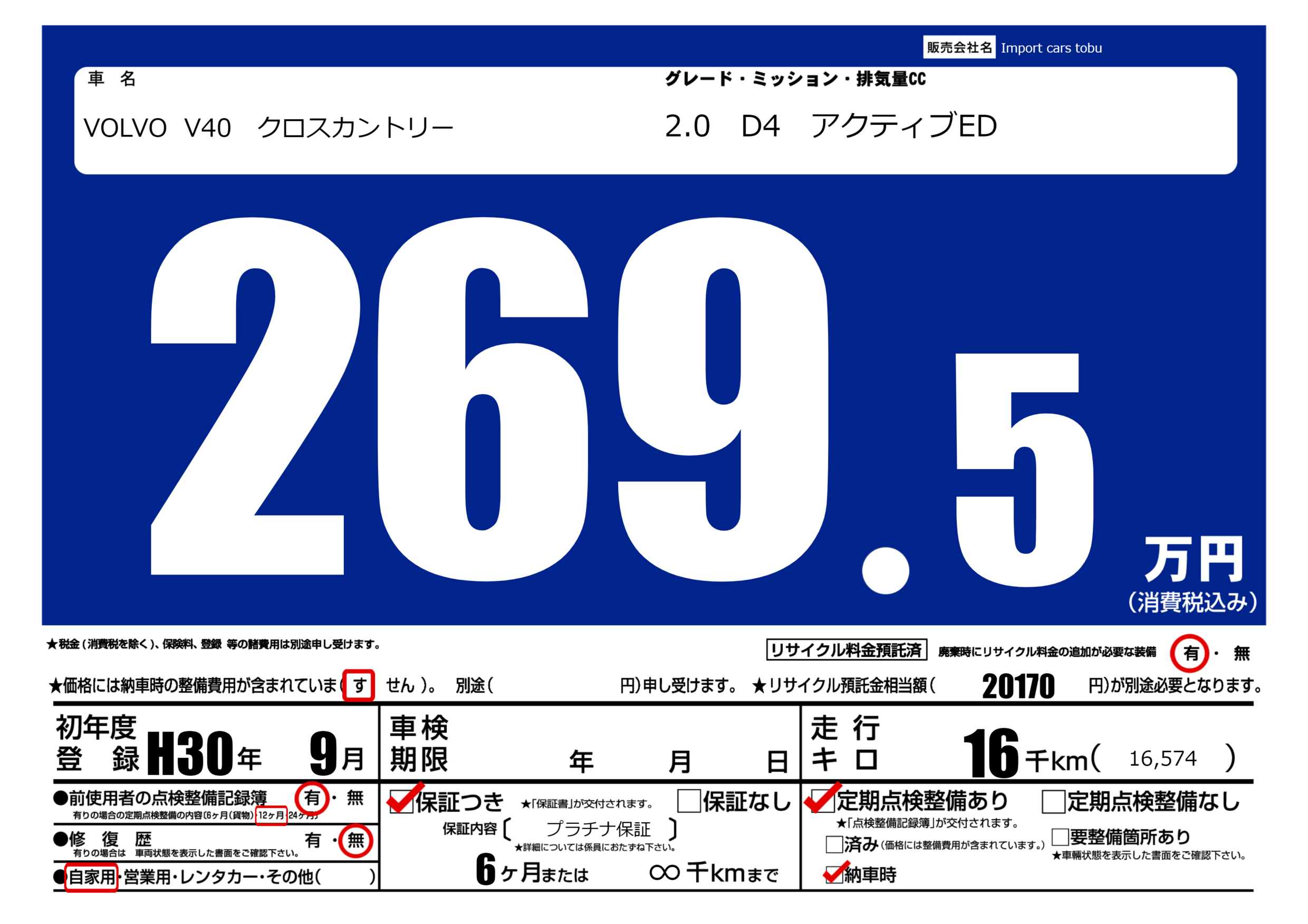 保証付き 保証内容( プラチナ保証) 6ヶ月または(∞)千kmまで |