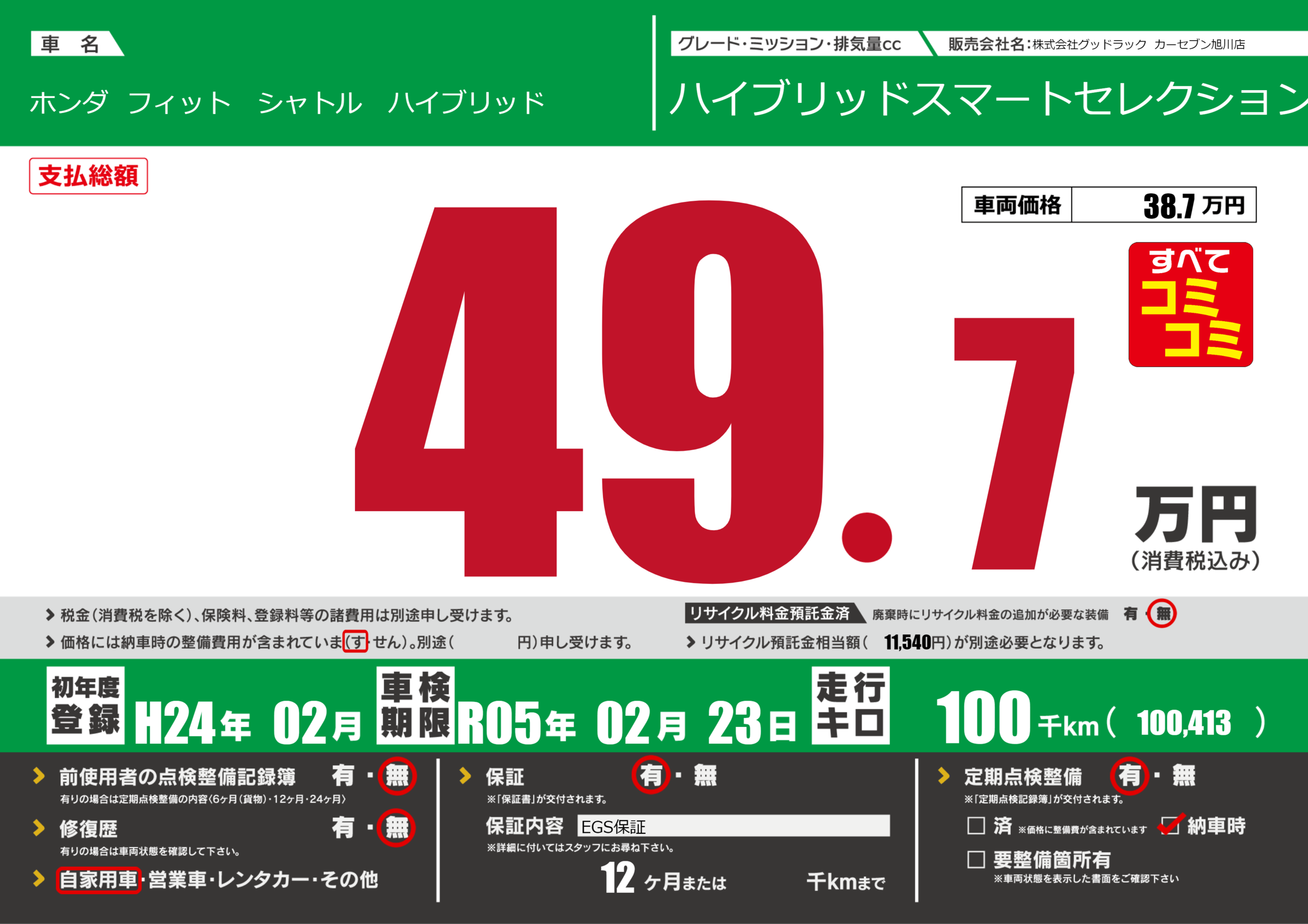 | 走行キロ | 10万km | 初年度登録 | H24年02月 |