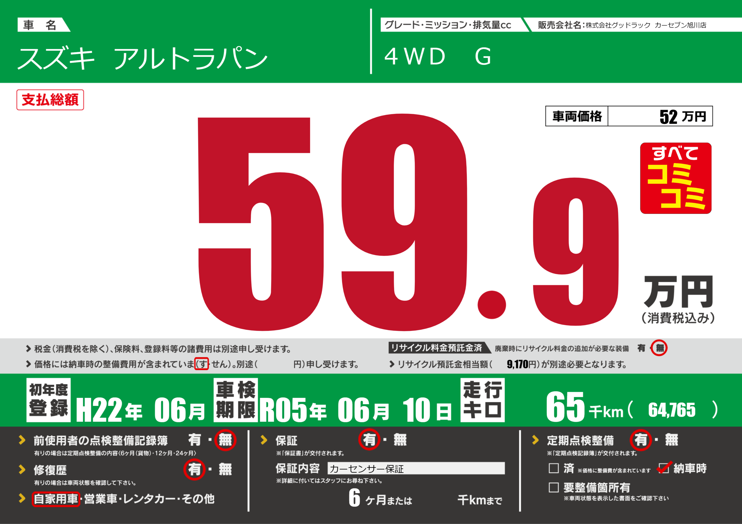 | 走行キロ | 6.5万km | 初年度登録 | H22年06月 |