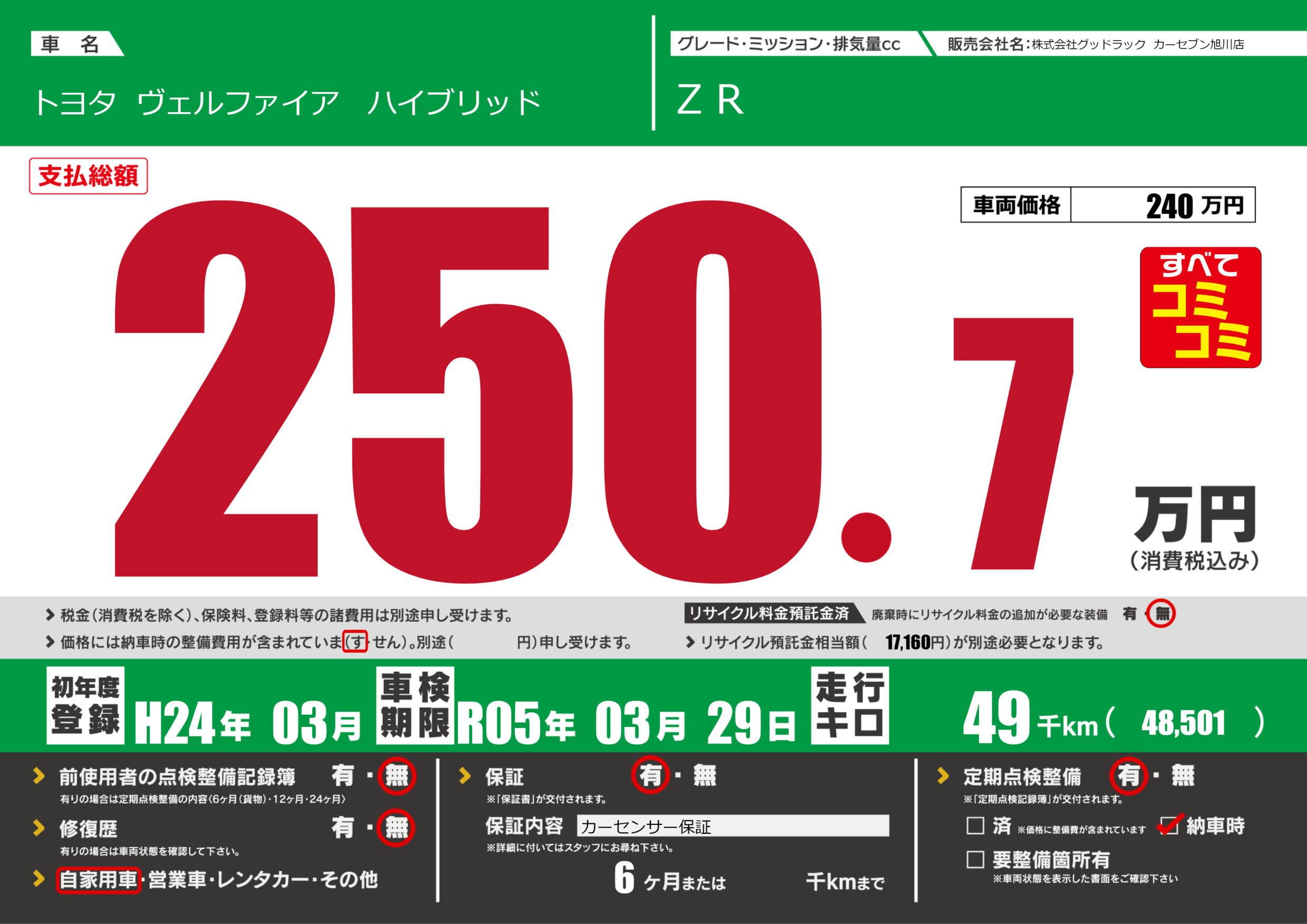 | 車名 | トヨタ ヴェルファイア ハイブリッド | グレード ミッション 排気量 |