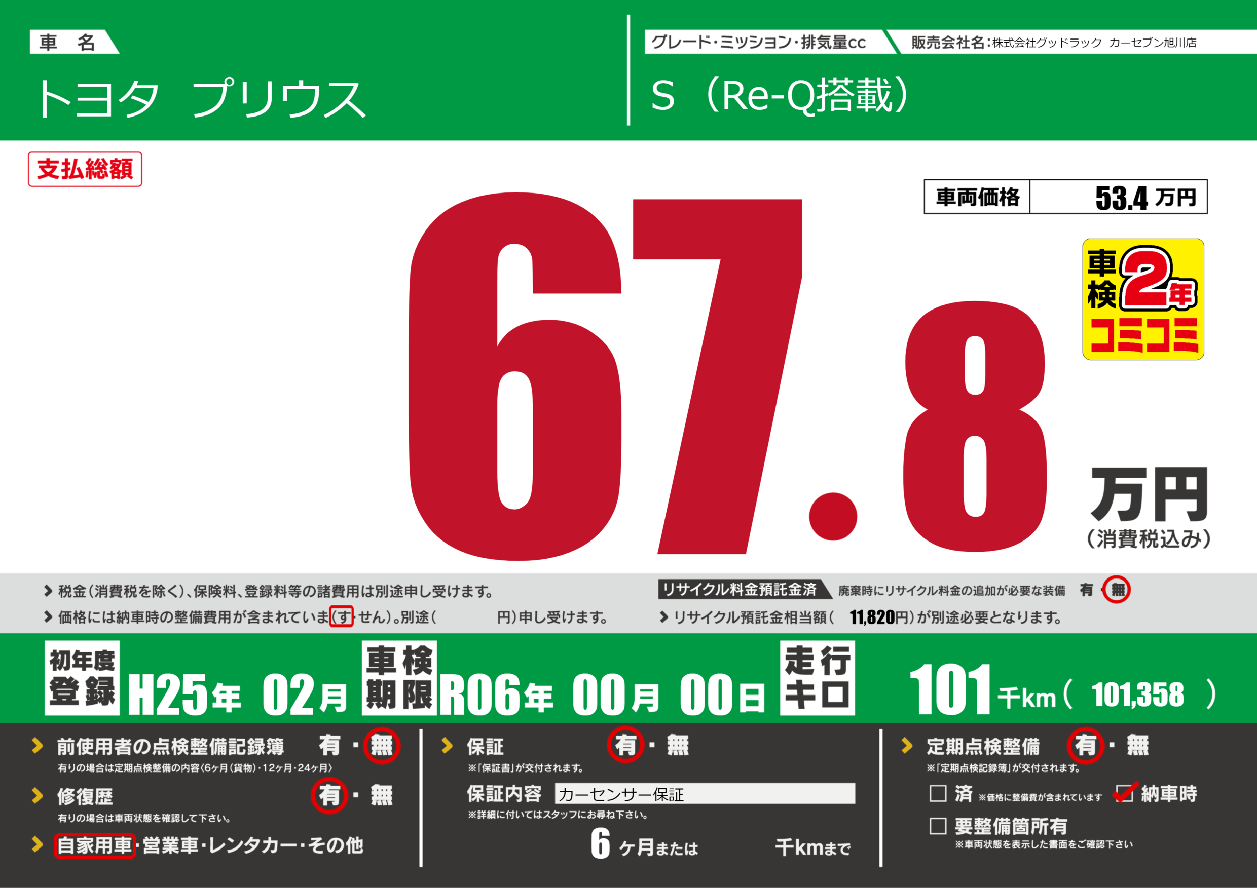 | 車名 | トヨタ プリウス | グレード ミッション 排気量 |
