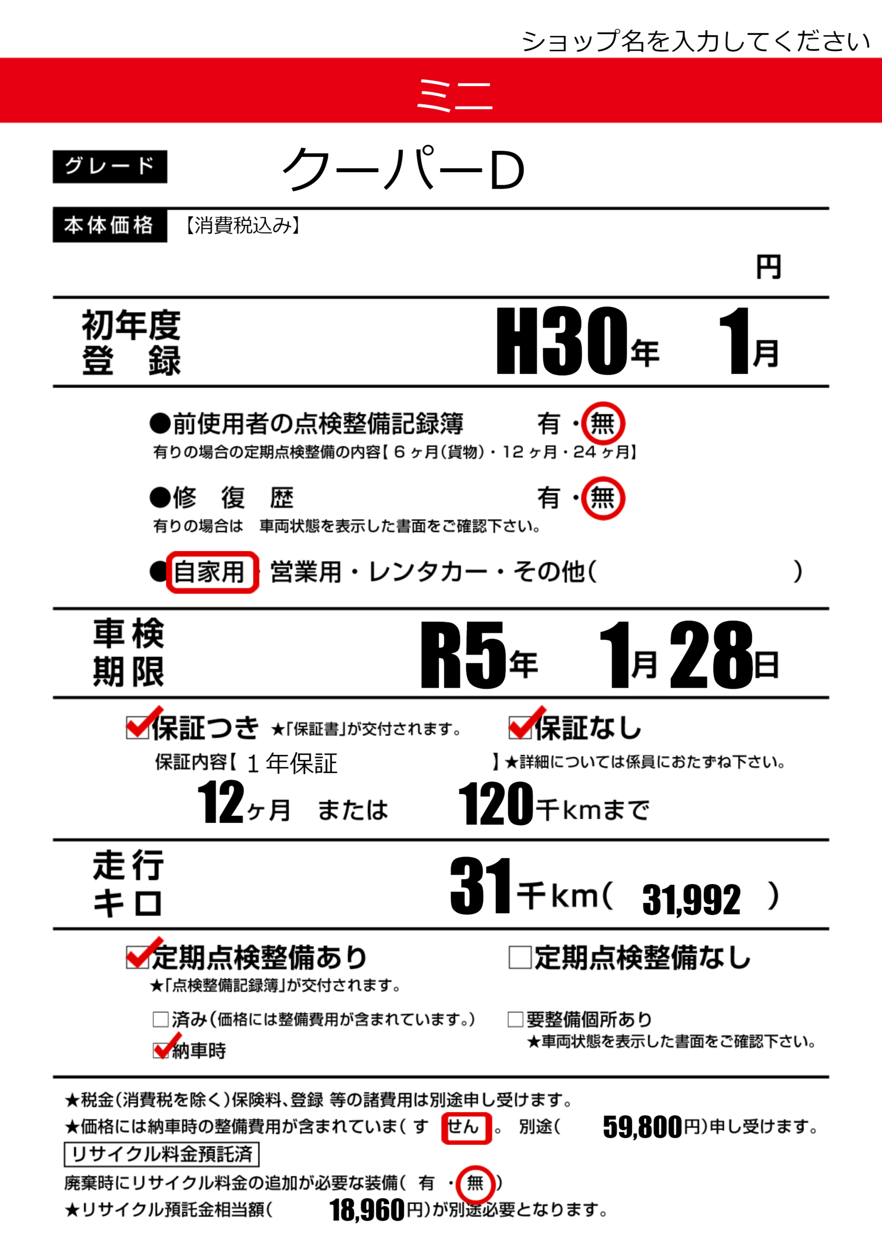 | 車名 | ミニ | グレード ミッション 排気量 |