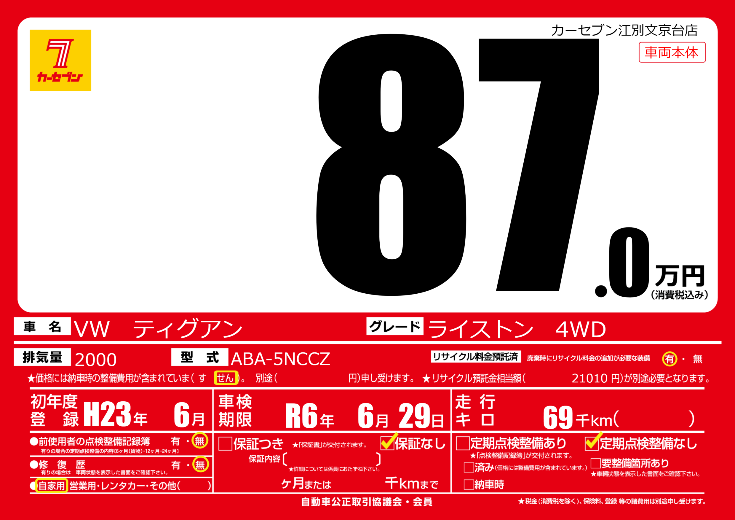 | 車名 | VW ティグアン | グレード ミッション 排気量 |