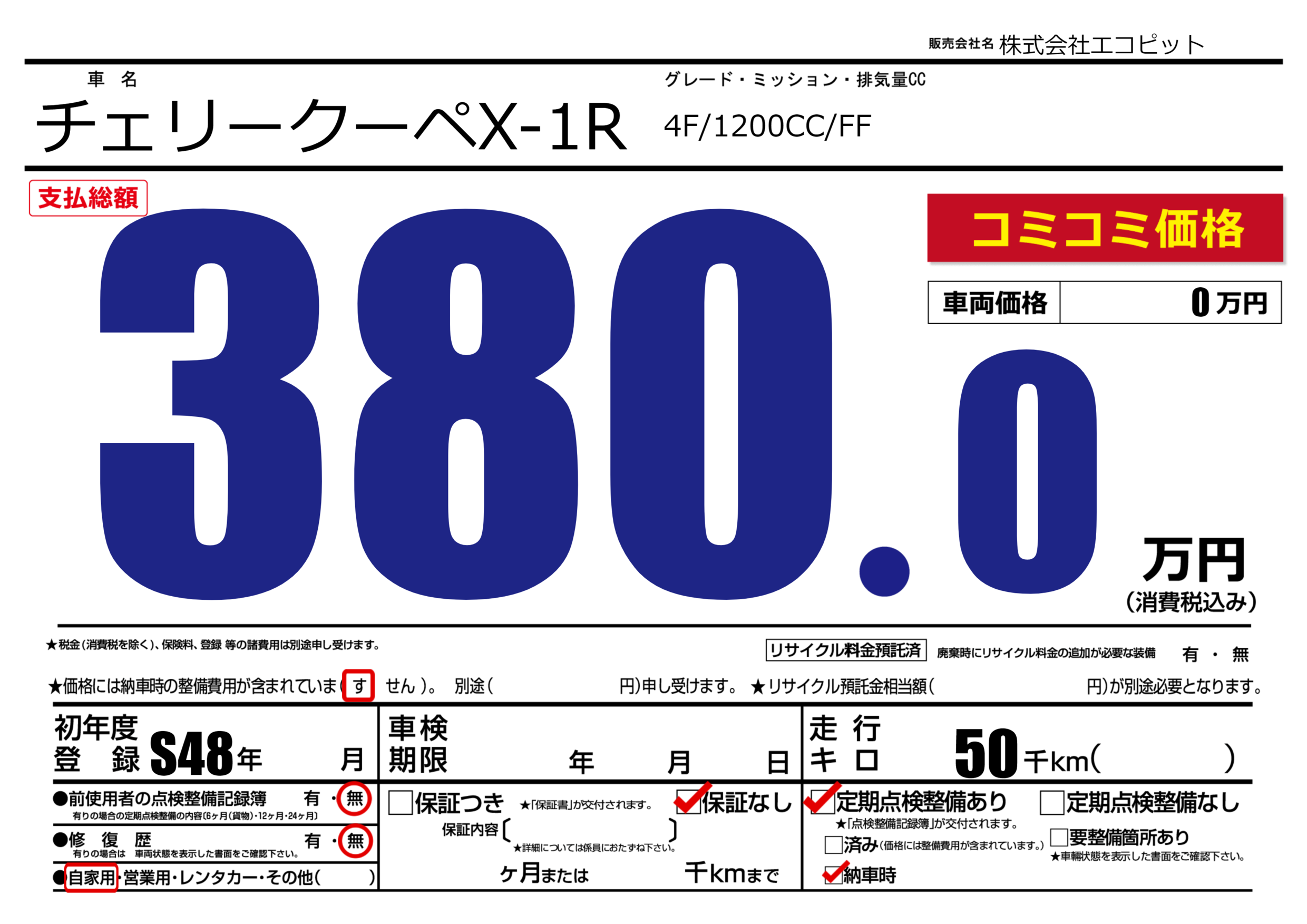| 車名 | チェリークーペX-1R | グレード ミッション 排気量 |
