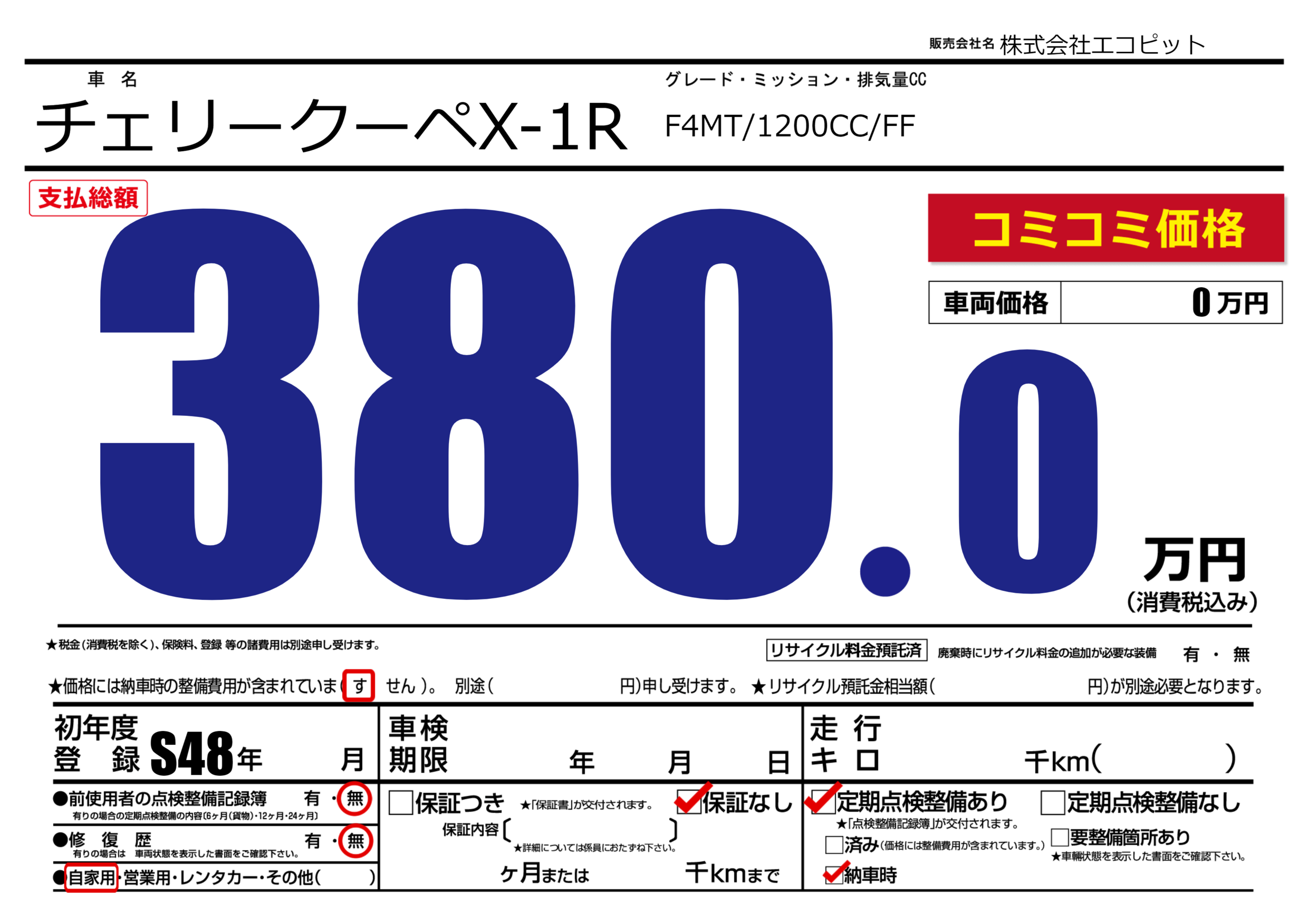 | 車名 | チェリークーペX-1R | グレード ミッション 排気量 |