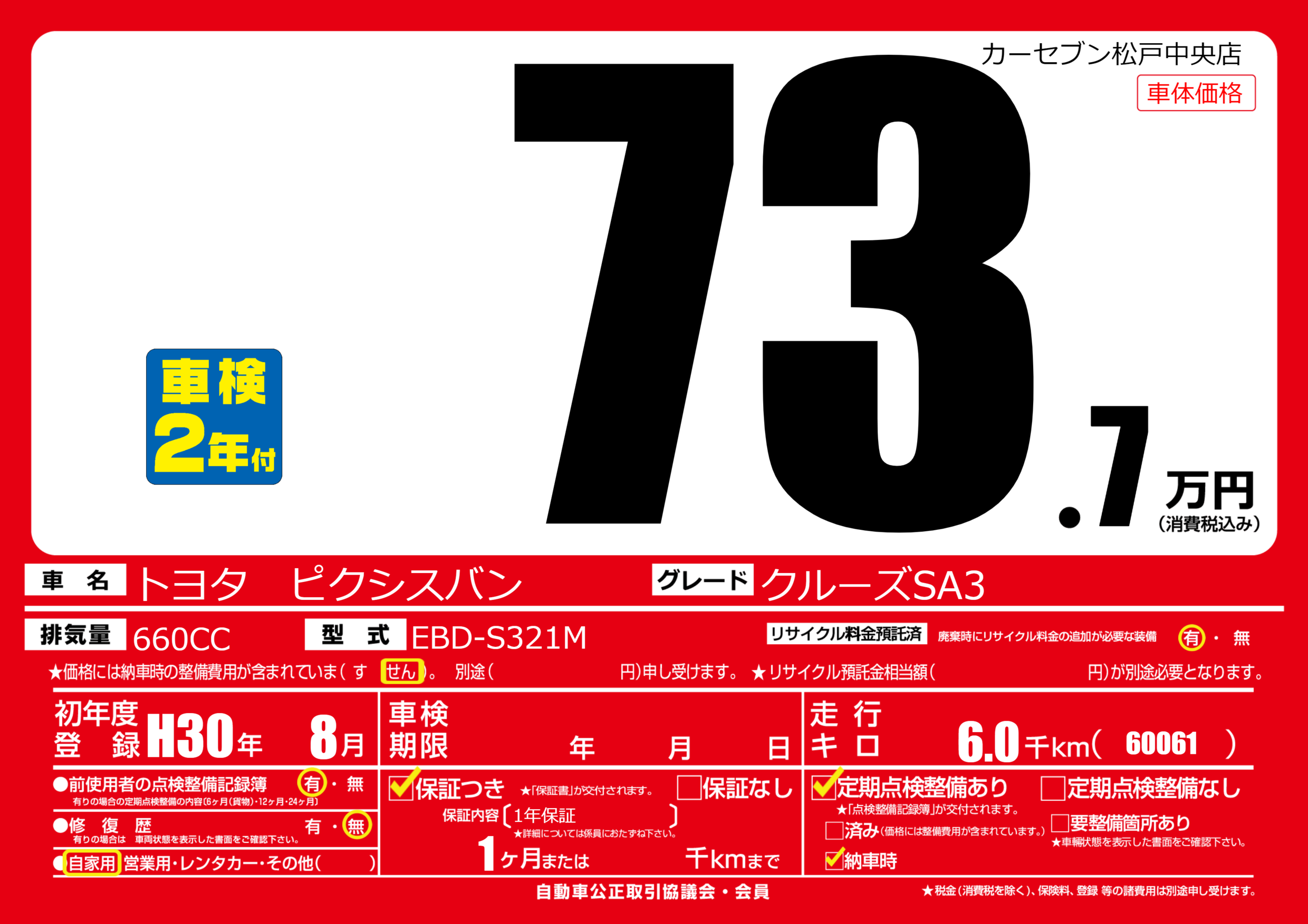 | 走行キロ | 0.6万km | 初年度登録 | H30年8月 |