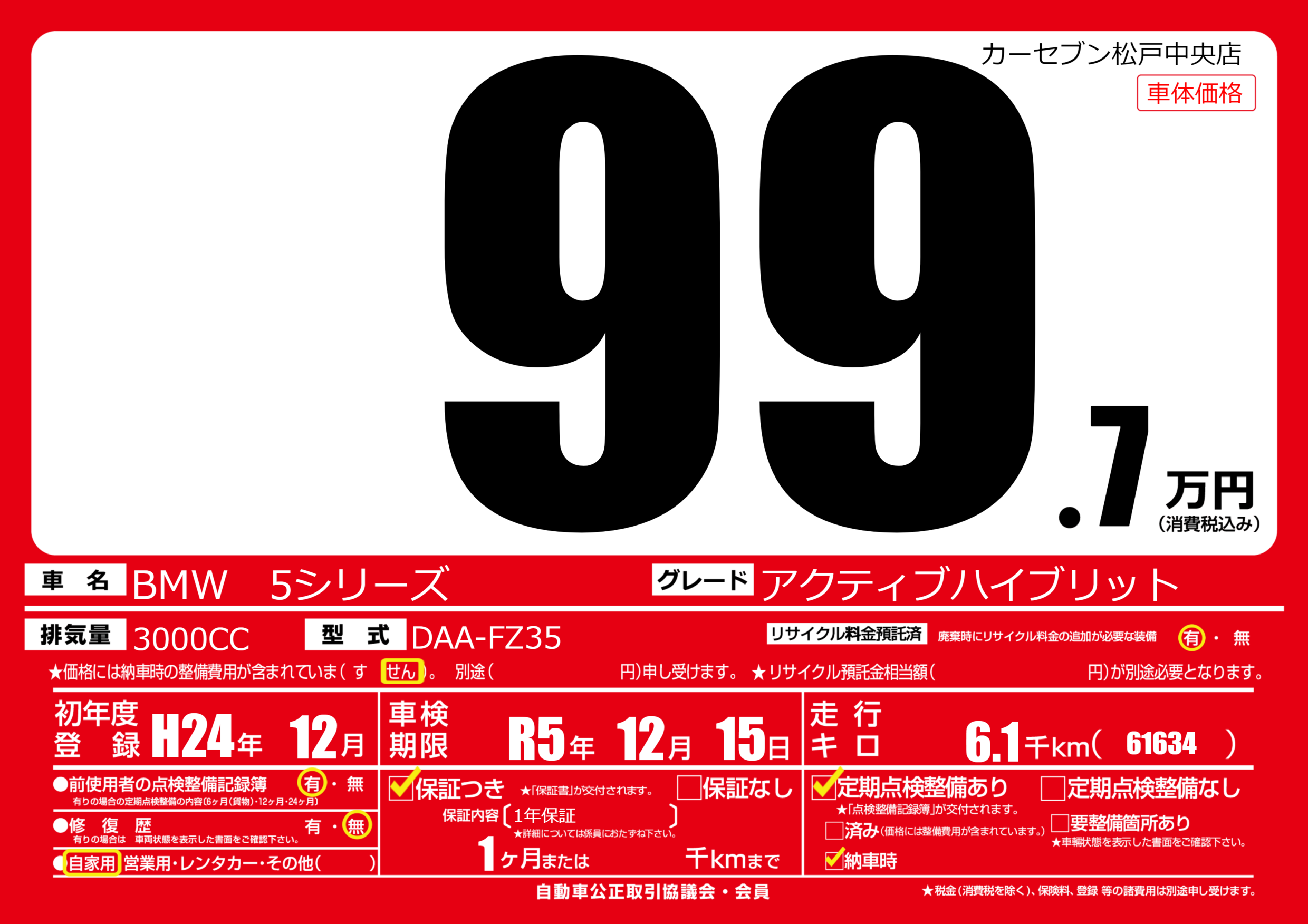 | 車名 | BMW 5シリーズ | グレード ミッション 排気量 |