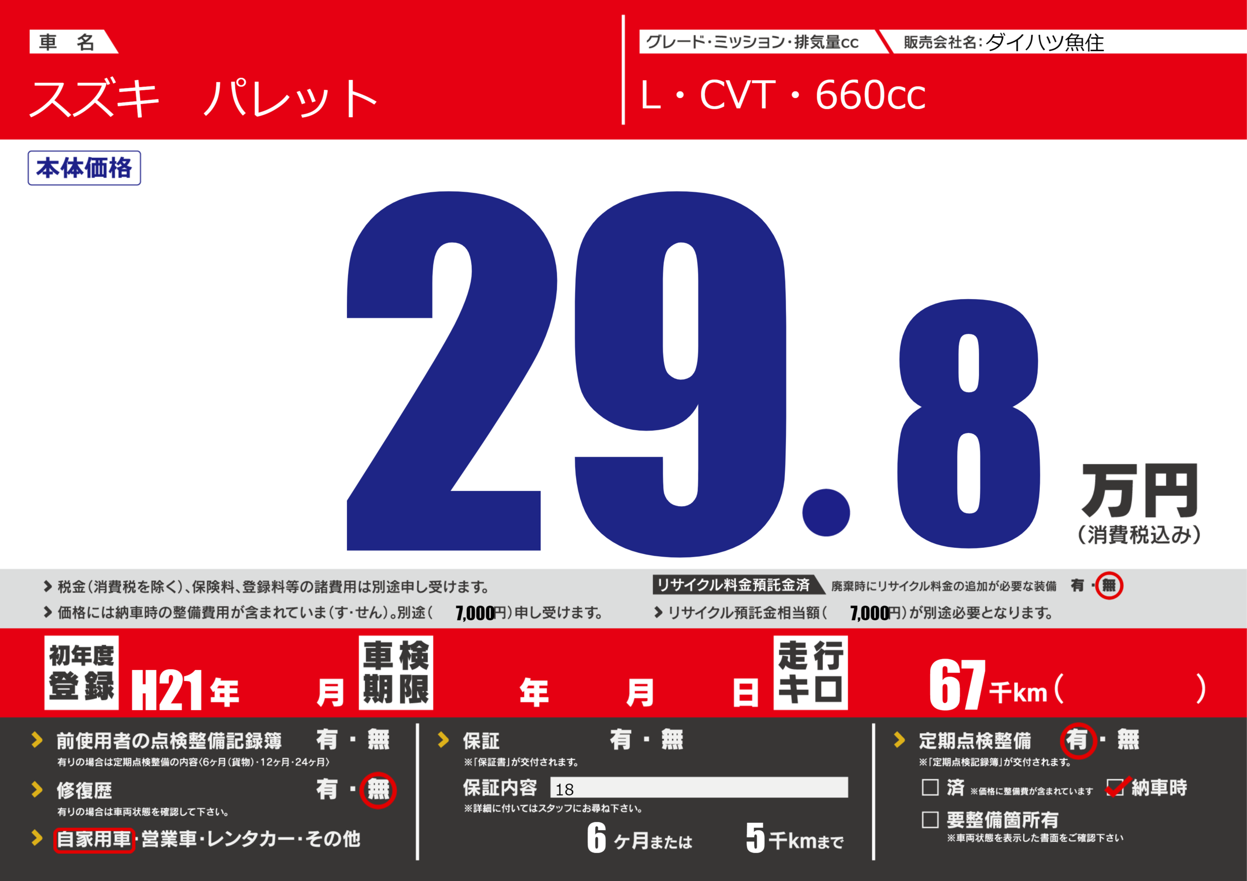 保証なし 保証内容(18) 6ヶ月または(5)千kmまで |