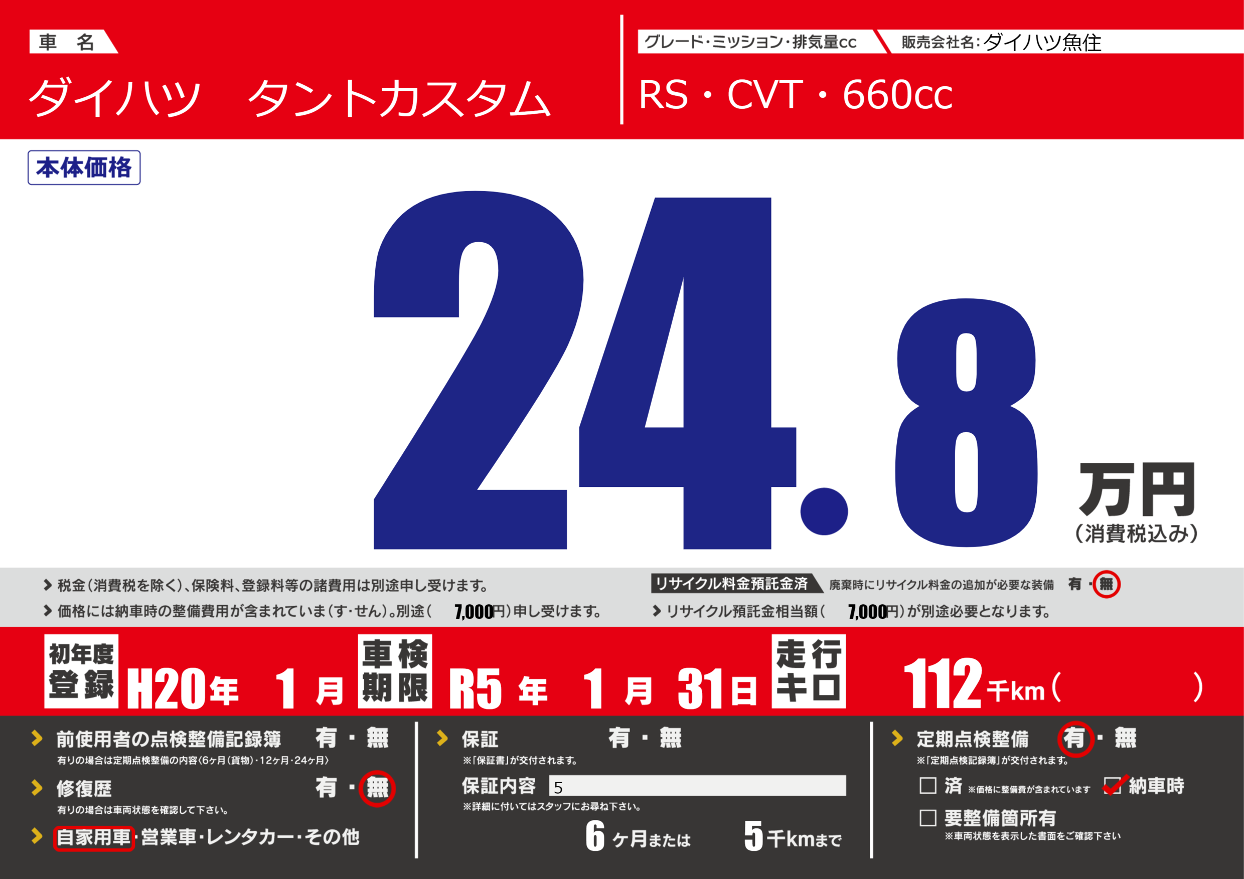 | 車名 | ダイハツ タントカスタム | グレード ミッション 排気量 |