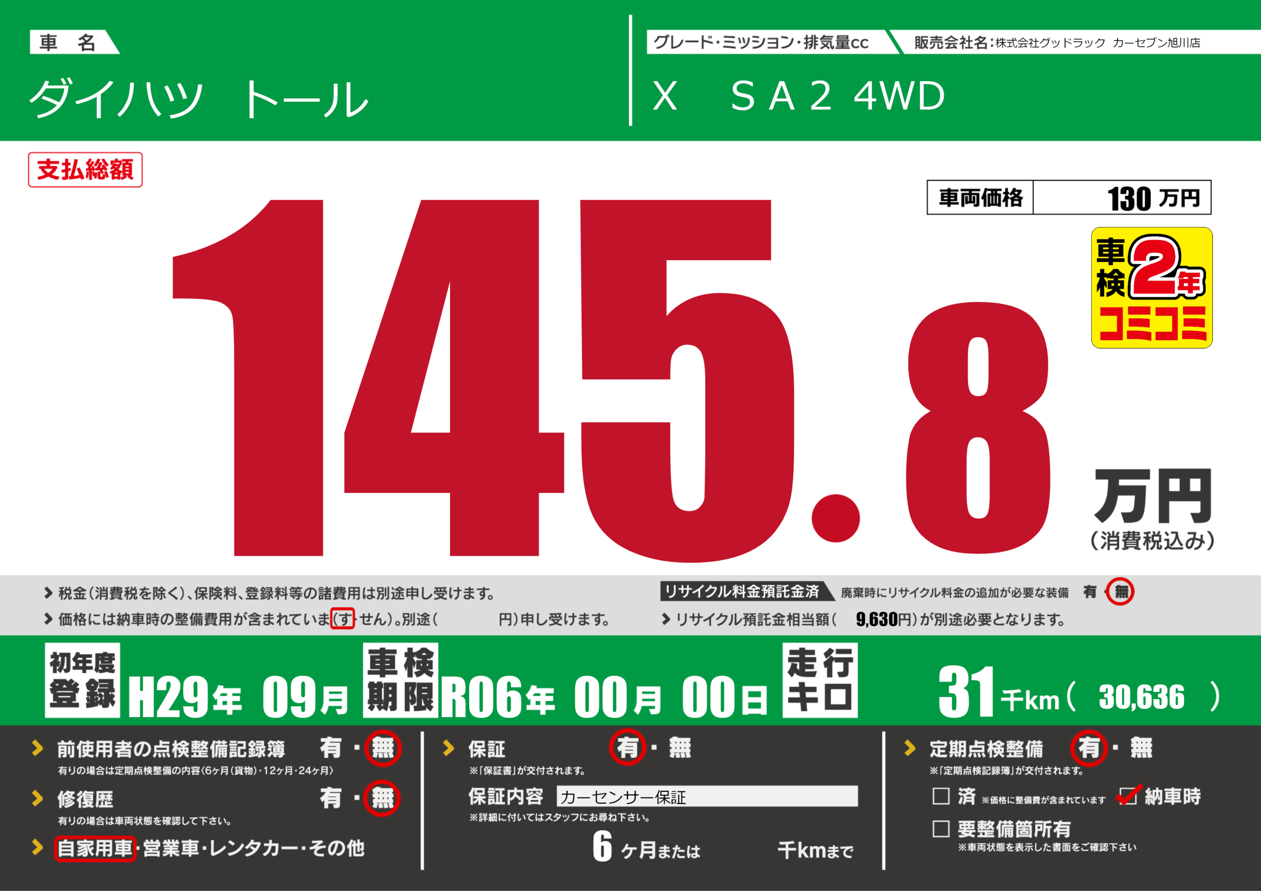 | 走行キロ | 3.1万km | 初年度登録 | H29年09月 |