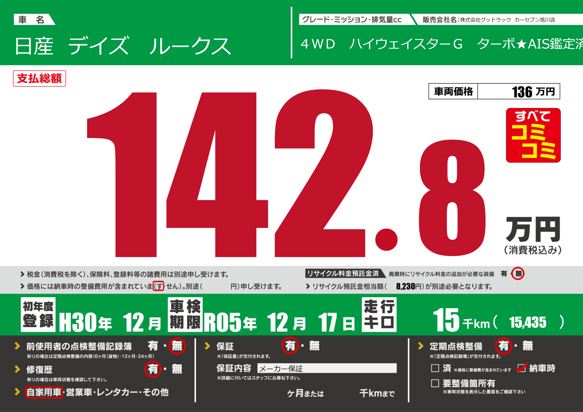 | 走行キロ | 1.5万km | 初年度登録 | H30年12月 |