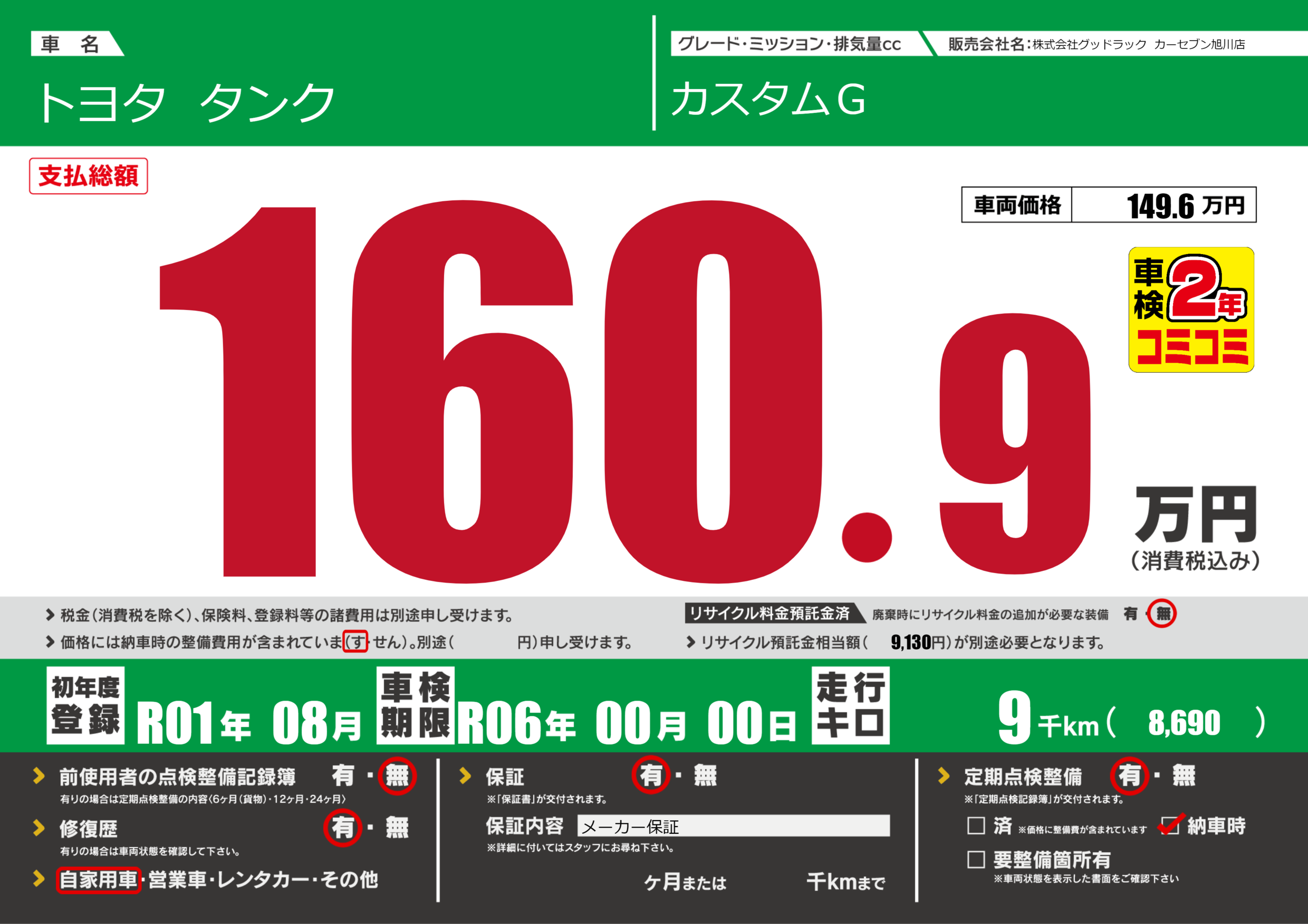 | 車名 | トヨタ タンク | グレード ミッション 排気量 |