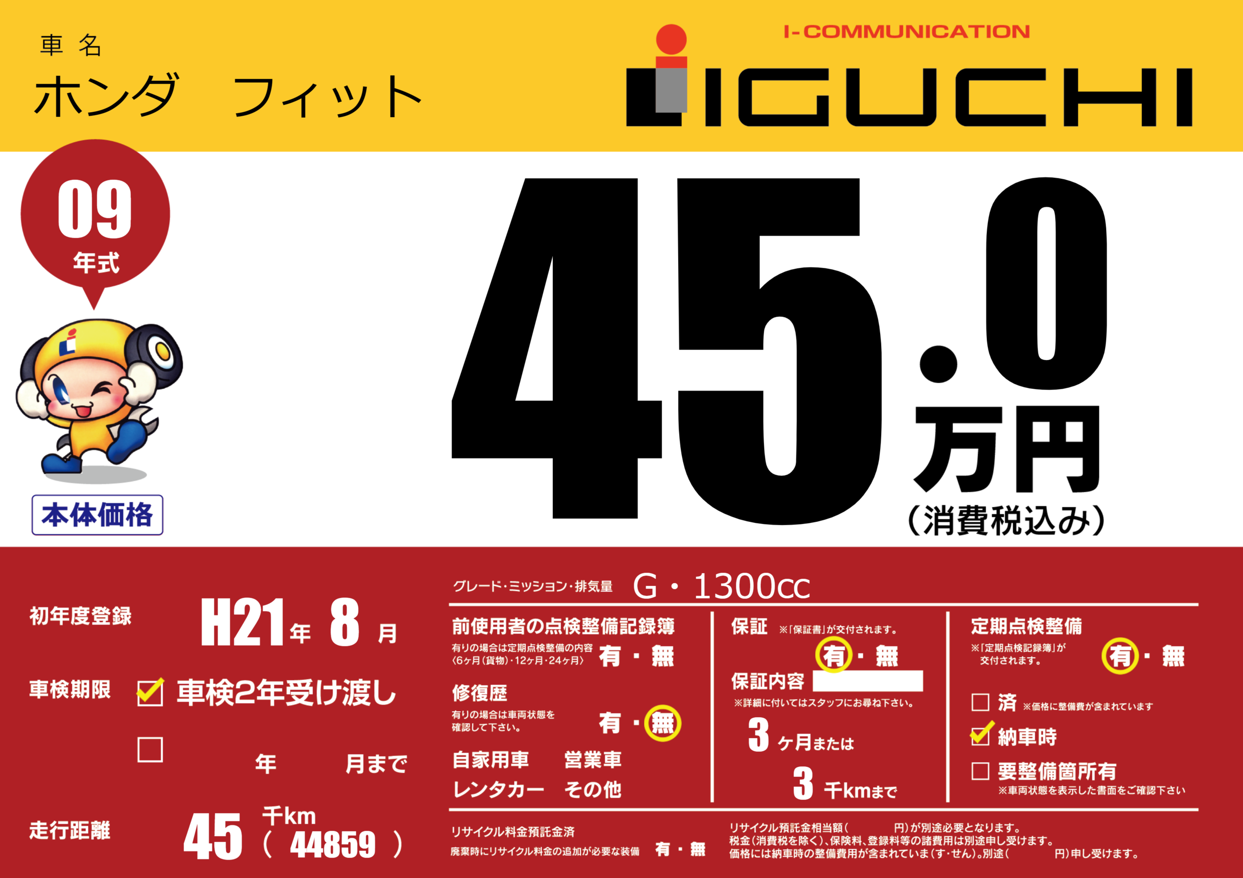 | 車名 | ホンダ フィット | グレード ミッション 排気量 |